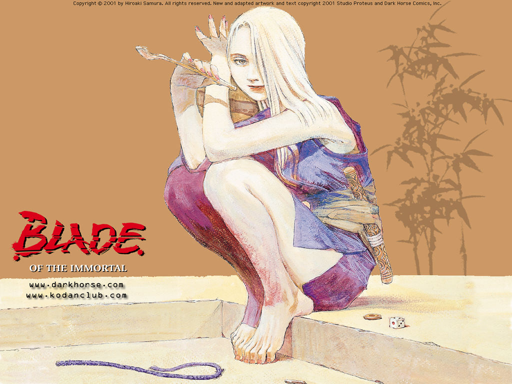 Description: A woman sitting on a step with a knife in her hand and a bamboo tree behind her.