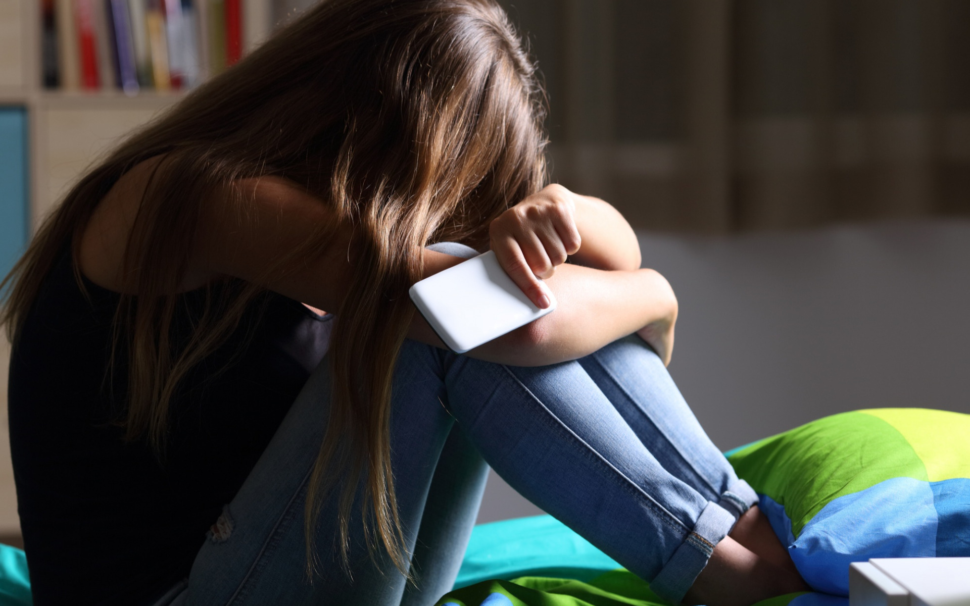 Description: A woman sitting on a bed with her head on her knees and her arm on her knees.