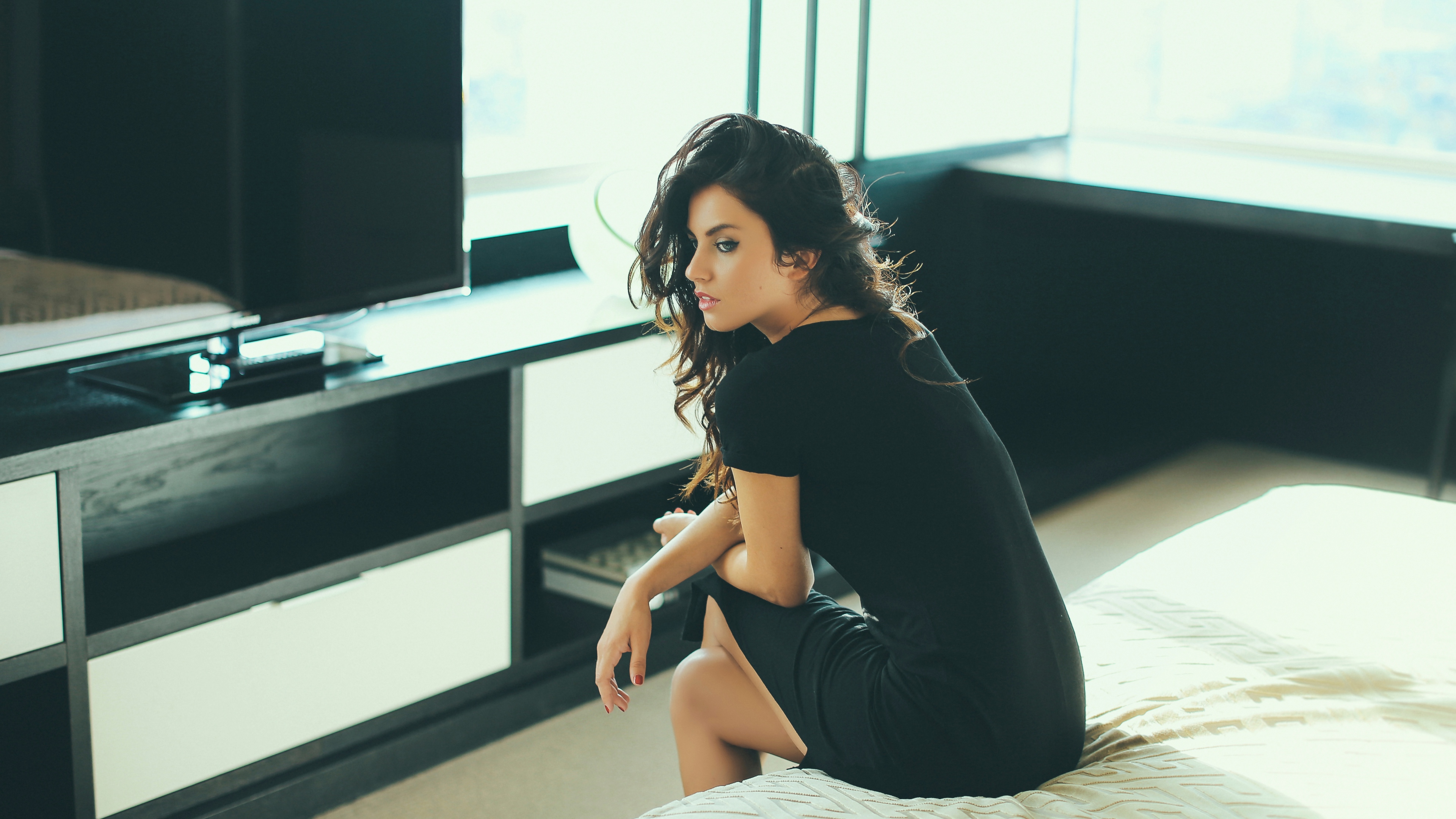 Description: A woman sitting on a bed in a room with a tv on the wall and a window behind her.