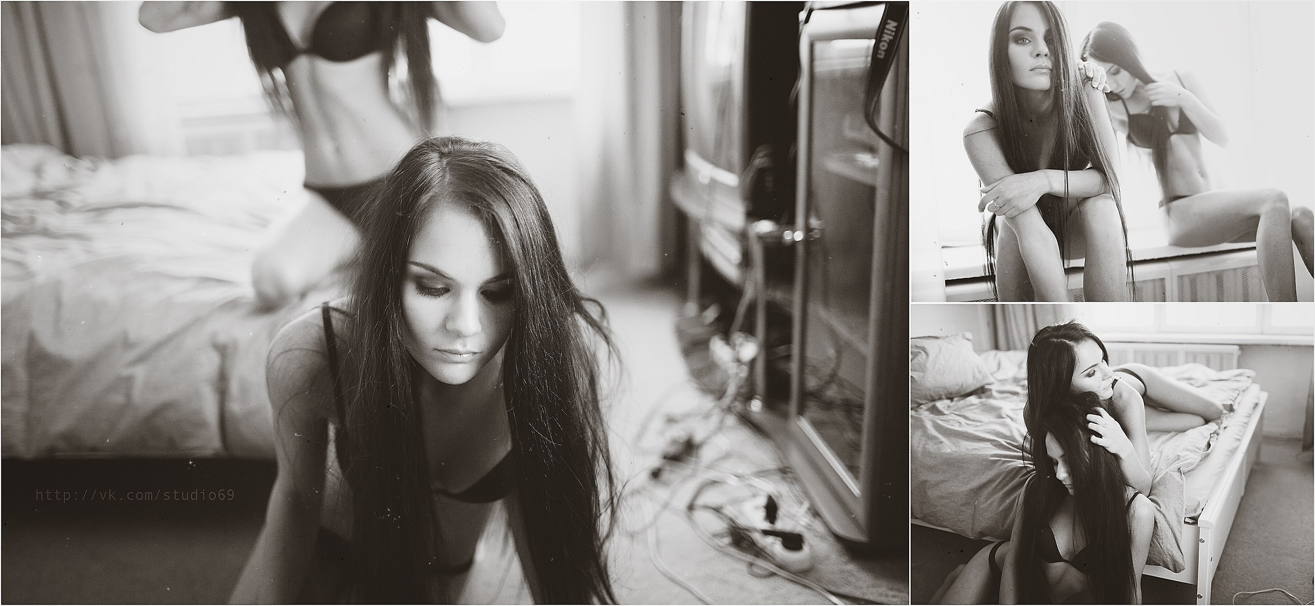 Description: A woman is sitting on a bed and posing for a picture in a black and white photo with a mirror.