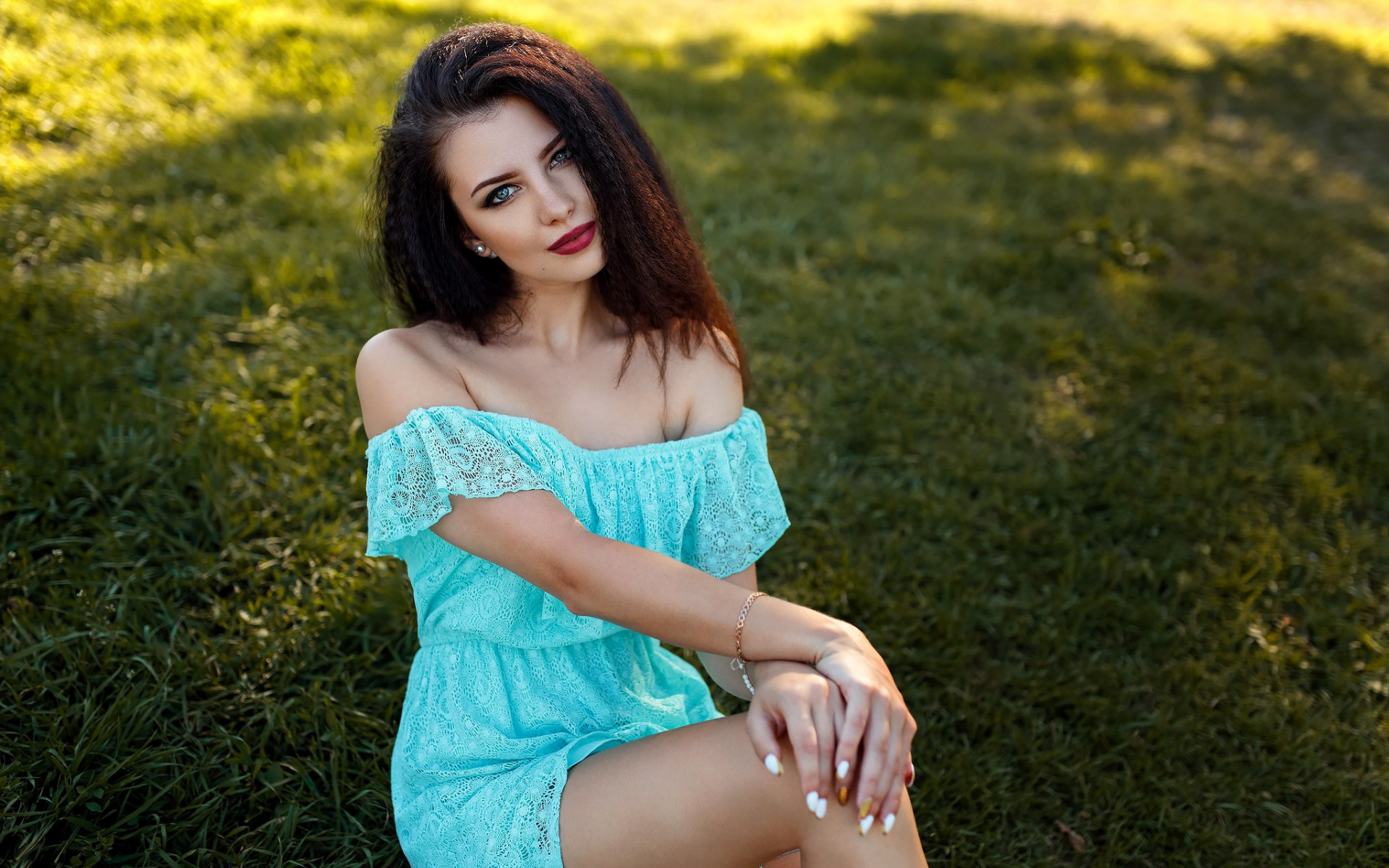 Description: A woman sitting on the grass in a blue dress with her legs crossed and her hand on her knee.