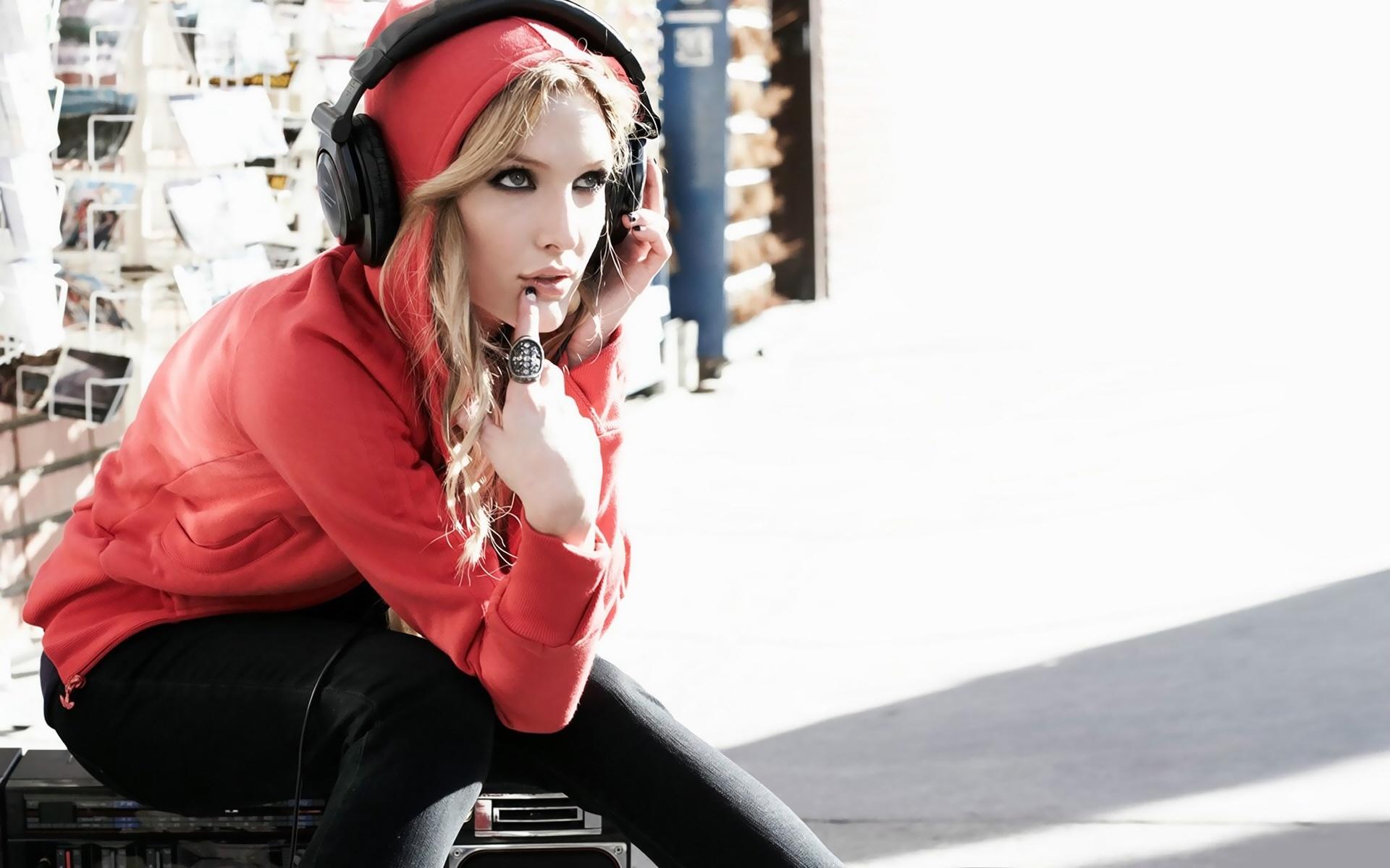 Description: A woman sitting on a box with headphones on her ears and a red jacket on her shoulders.