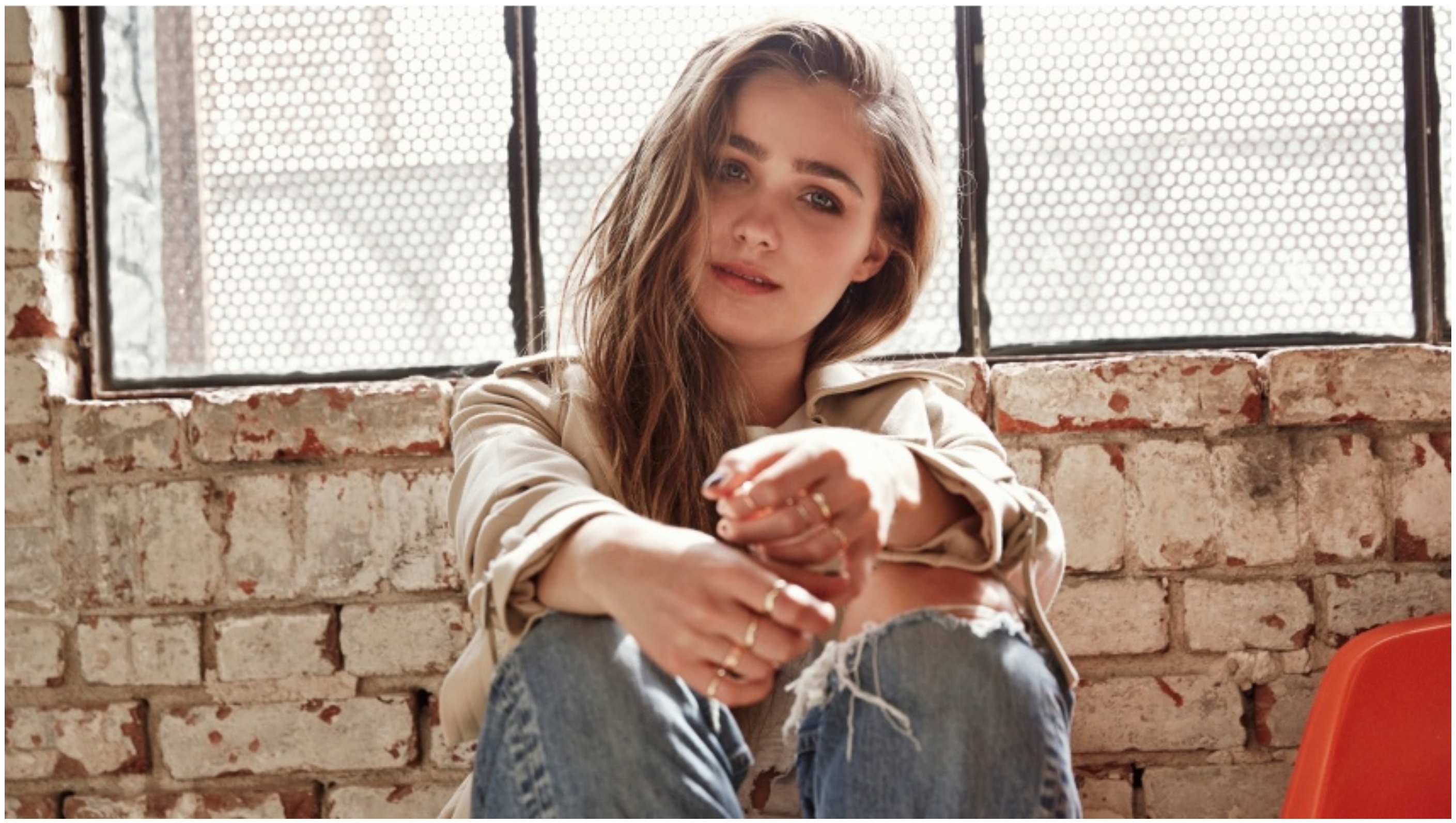Description: A woman sitting on a chair in front of a brick wall with a window behind her and a brick wall behind her.