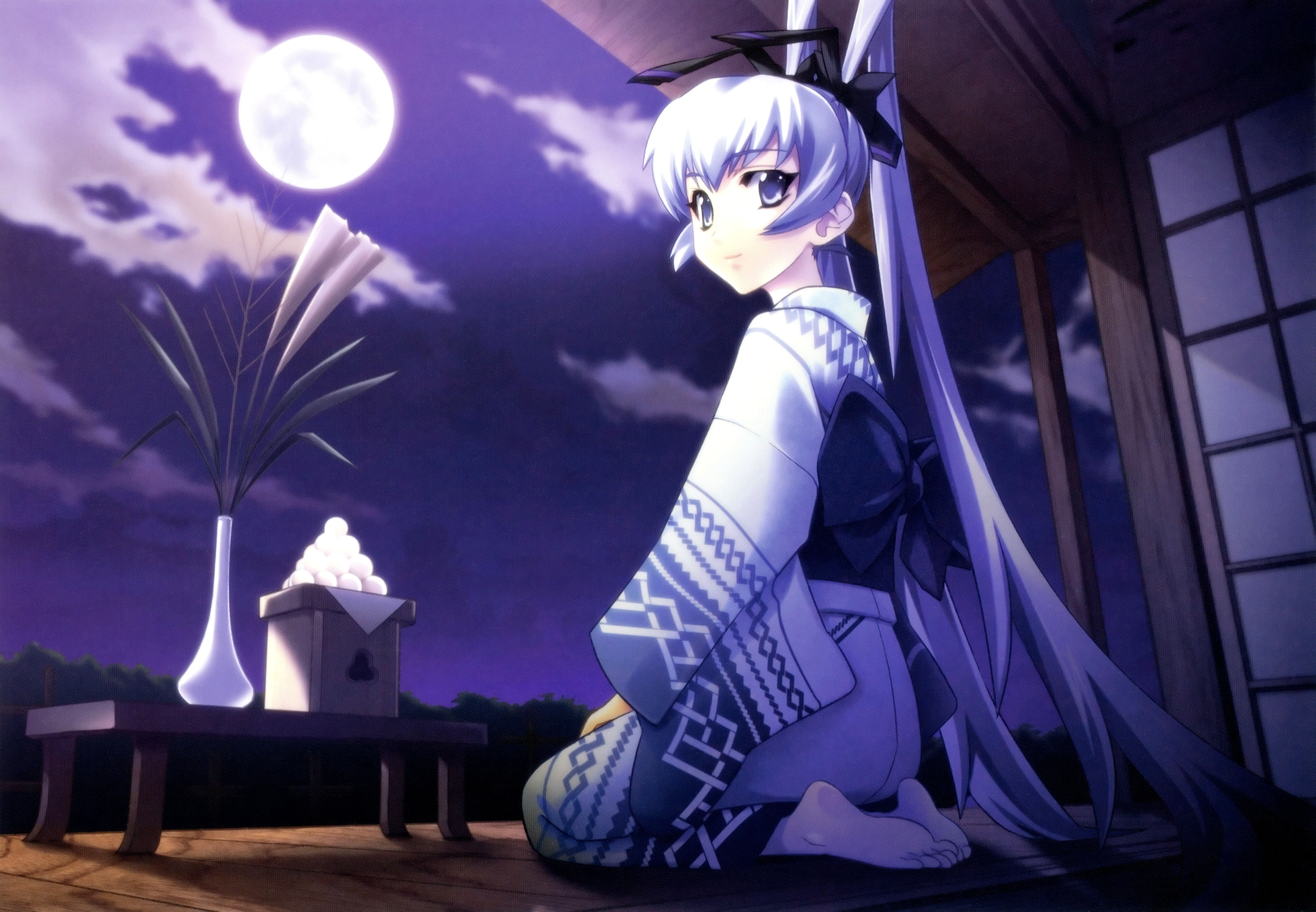Description: A woman sitting on the ground in front of a building with a sky background and a full moon in the background.