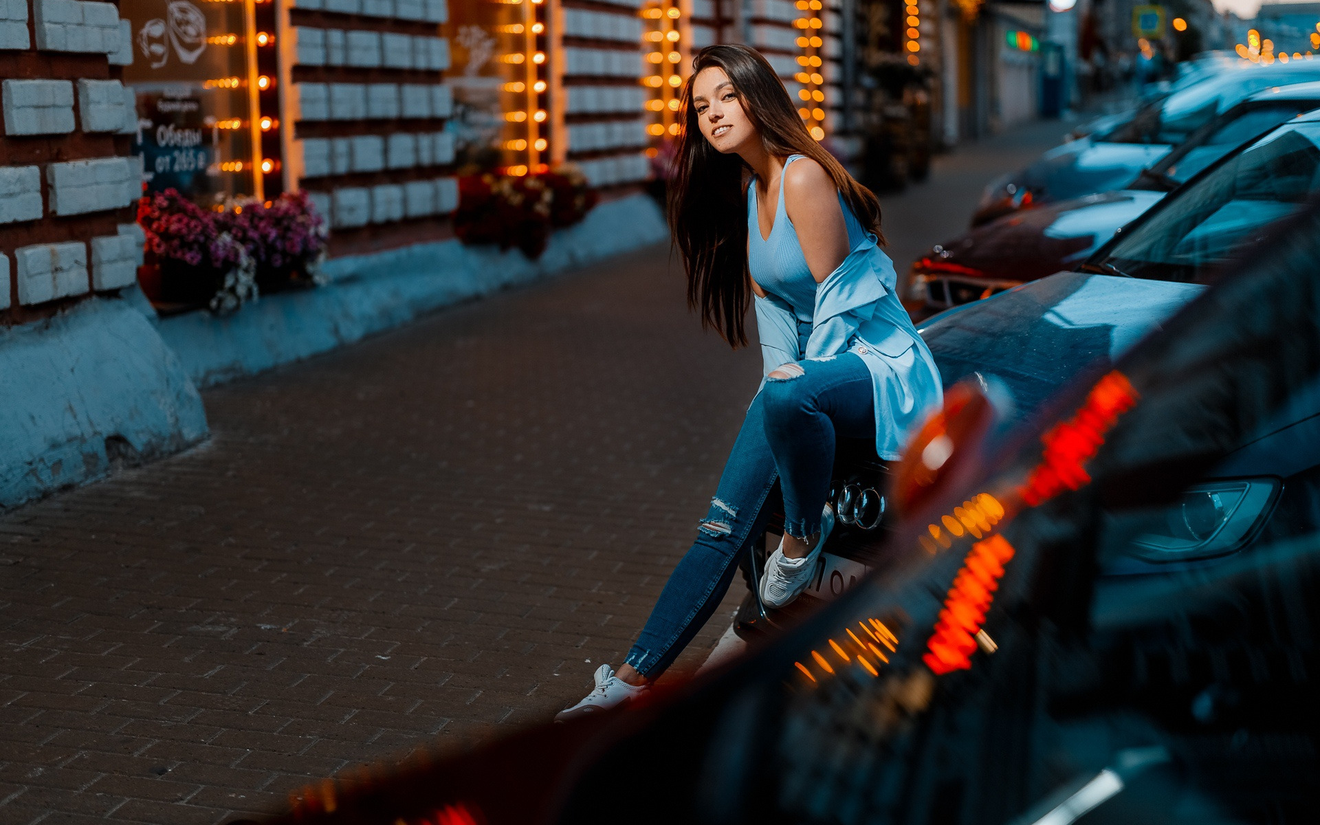 Description: A woman sitting on a car in a parking lot with a lot of parked cars behind her and a building with lights on.