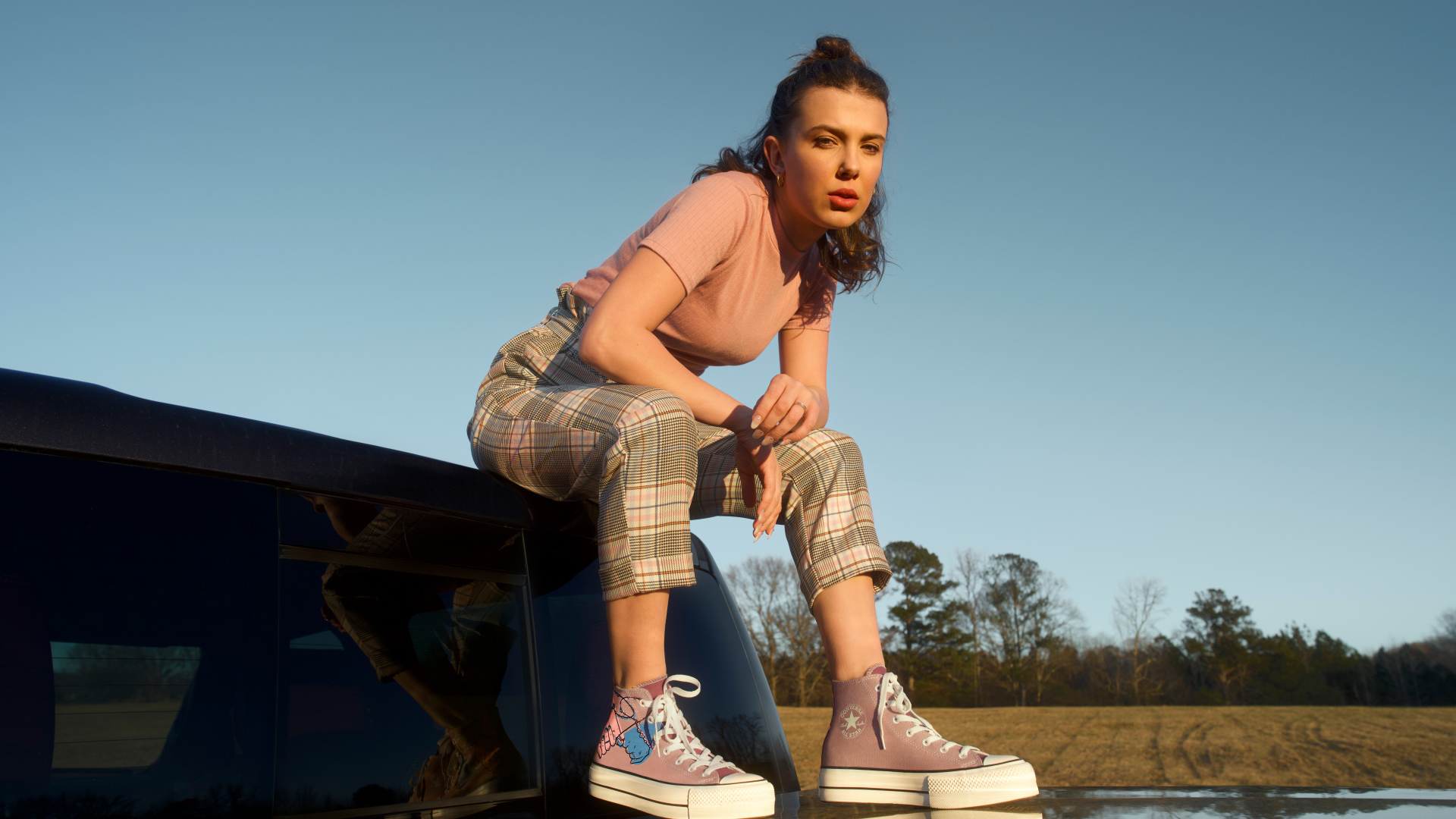 Description: A woman sitting on the hood of a car with her legs crossed and her shoes on the hood of the car.