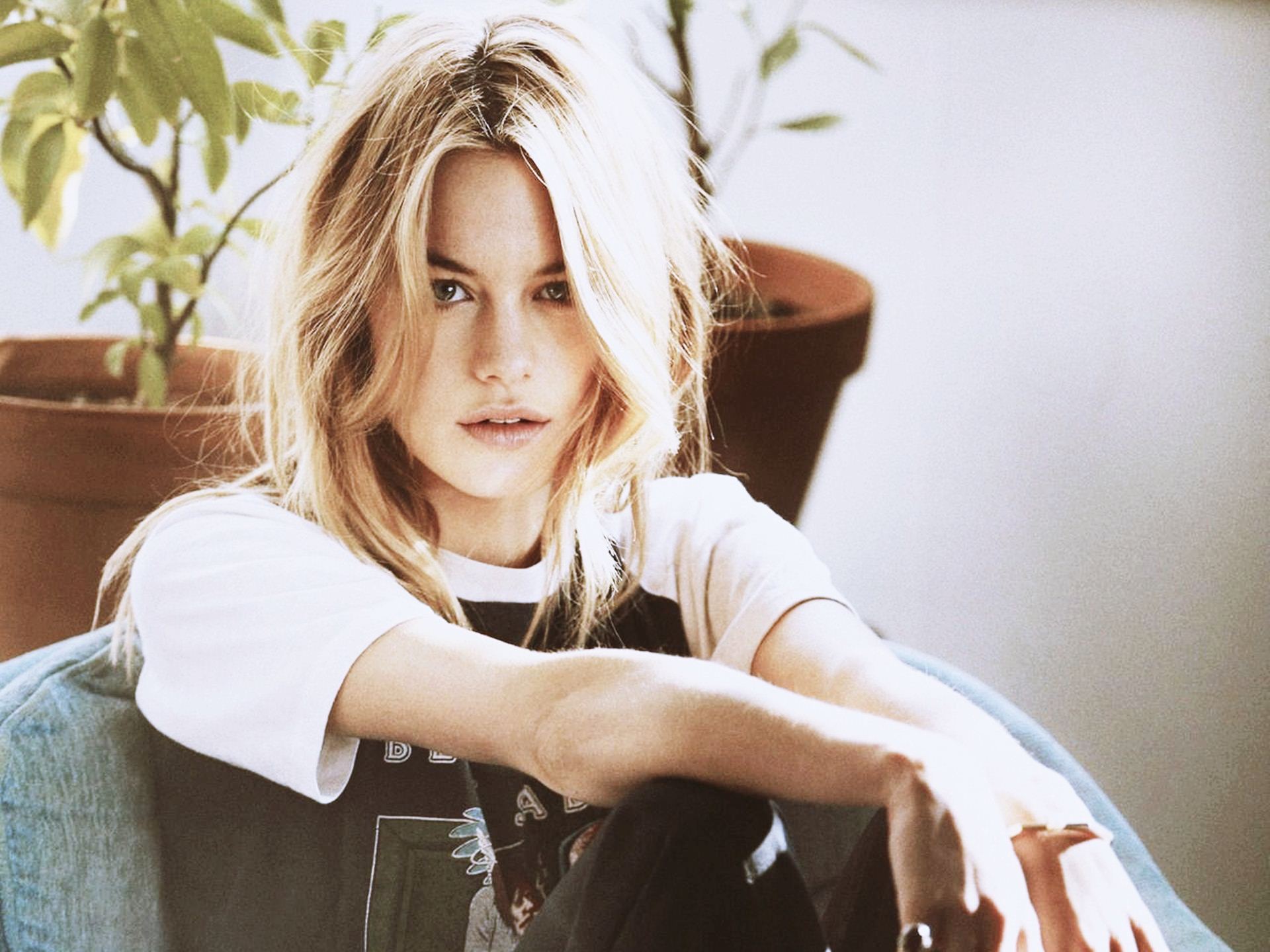 Description: A woman sitting on a chair with her arms crossed and a potted plant behind her in the background.