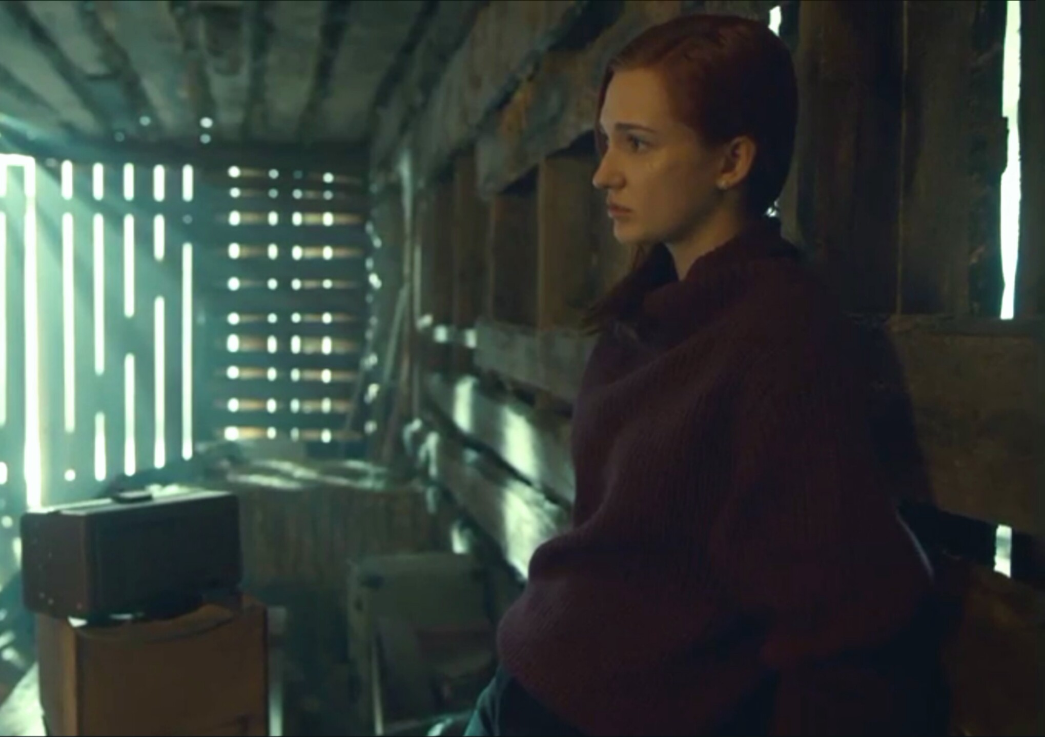 Description: A woman sitting in a chair in a room with a light coming through the window and a box on the floor.