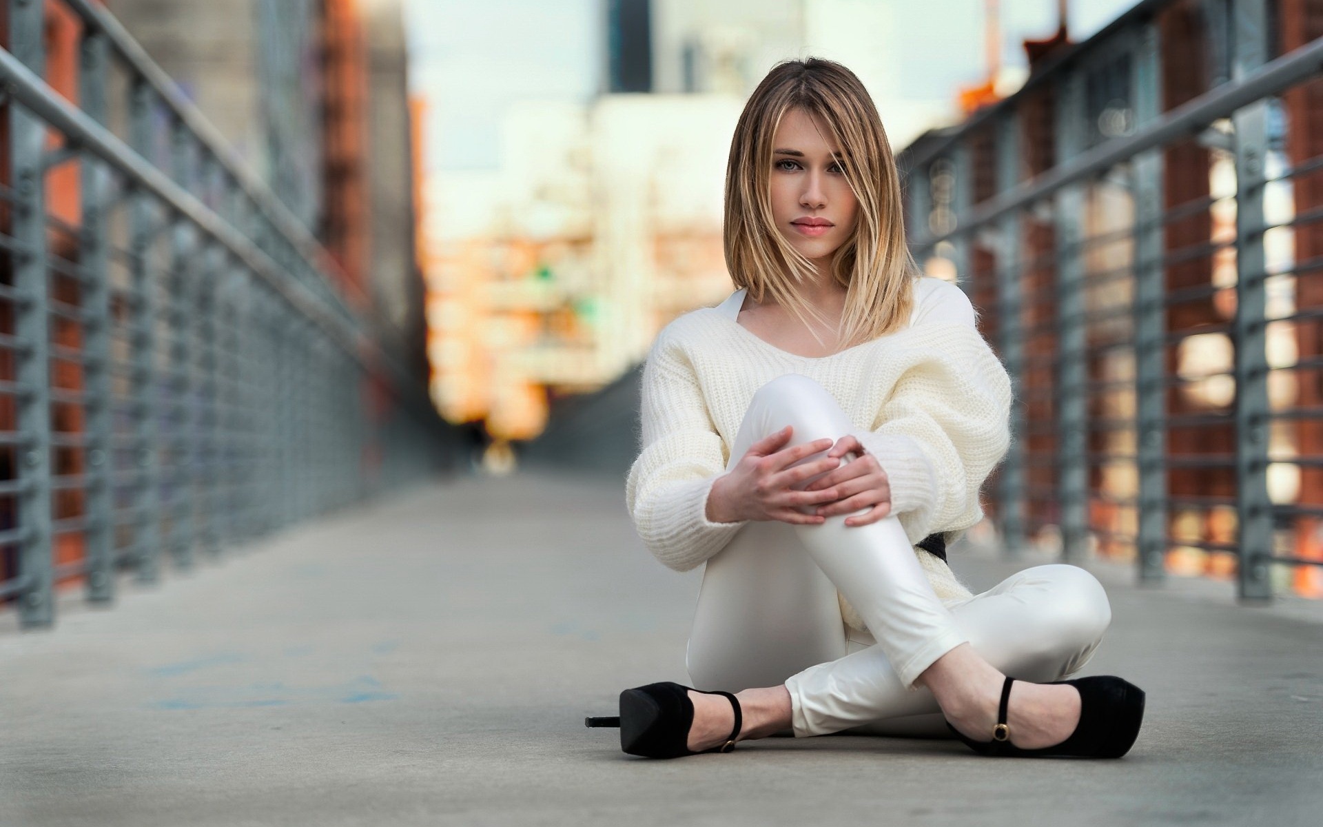 Description: A woman sitting on the ground with her legs crossed and her hand on her knees.