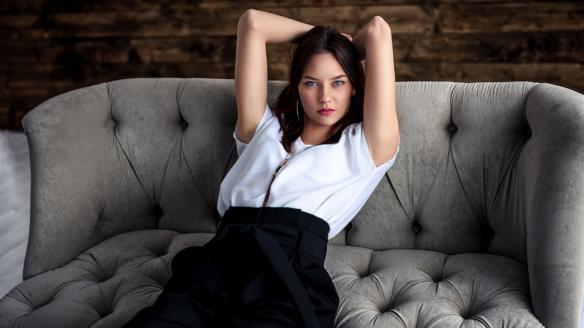 Description: A woman sitting on a couch with her arms behind her head and her legs behind her head.