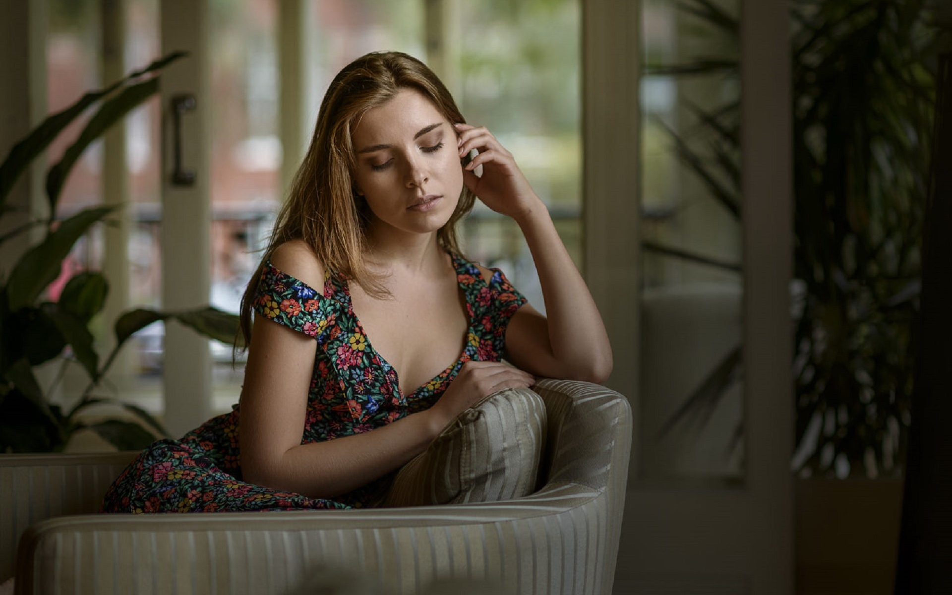 Description: A woman sitting on a couch talking on a cell phone in a room with large windows and a potted plant.