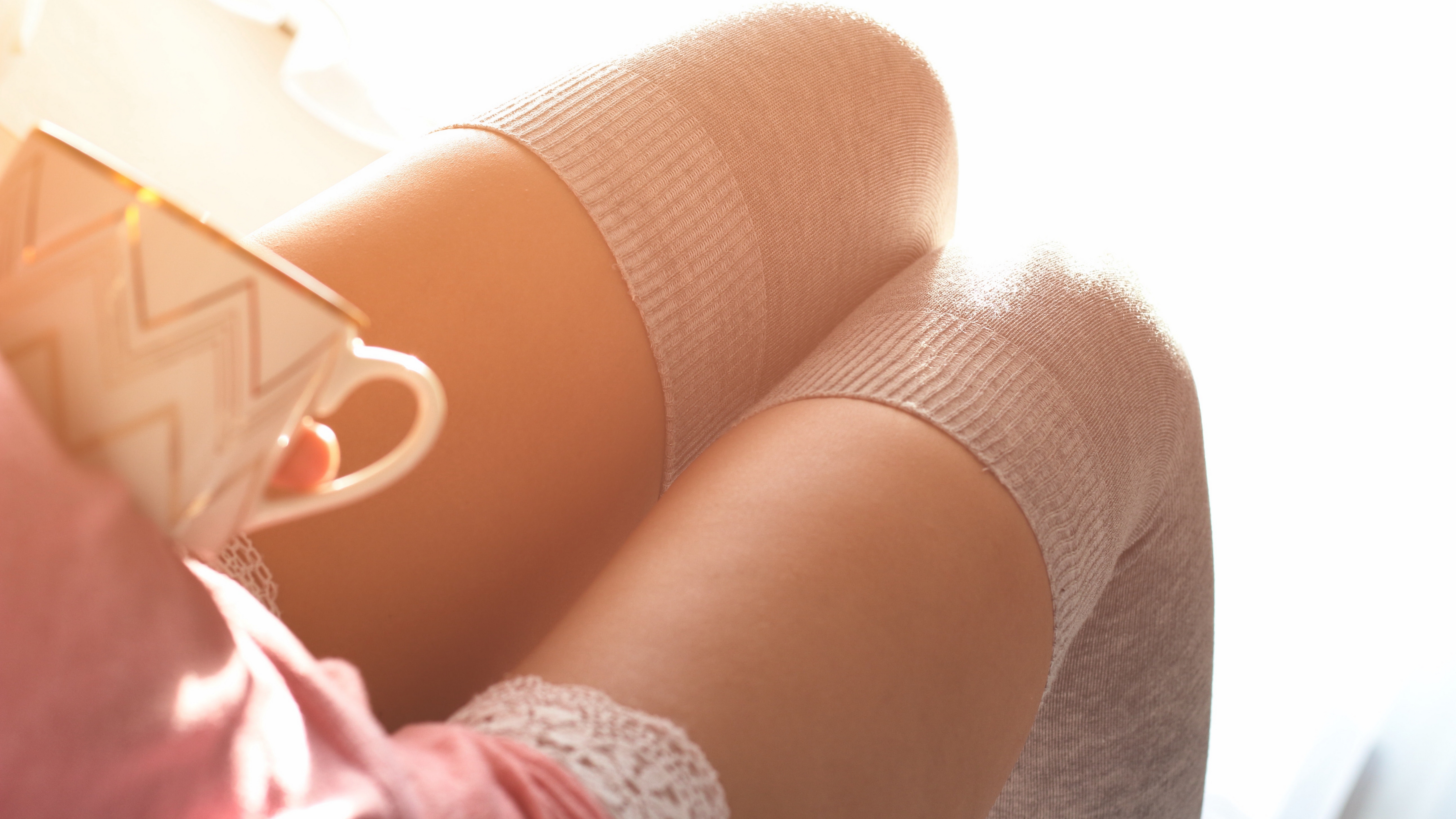 Description: A woman is sitting down with her legs crossed and a book in her hand is on her lap and a cup is in her lap.