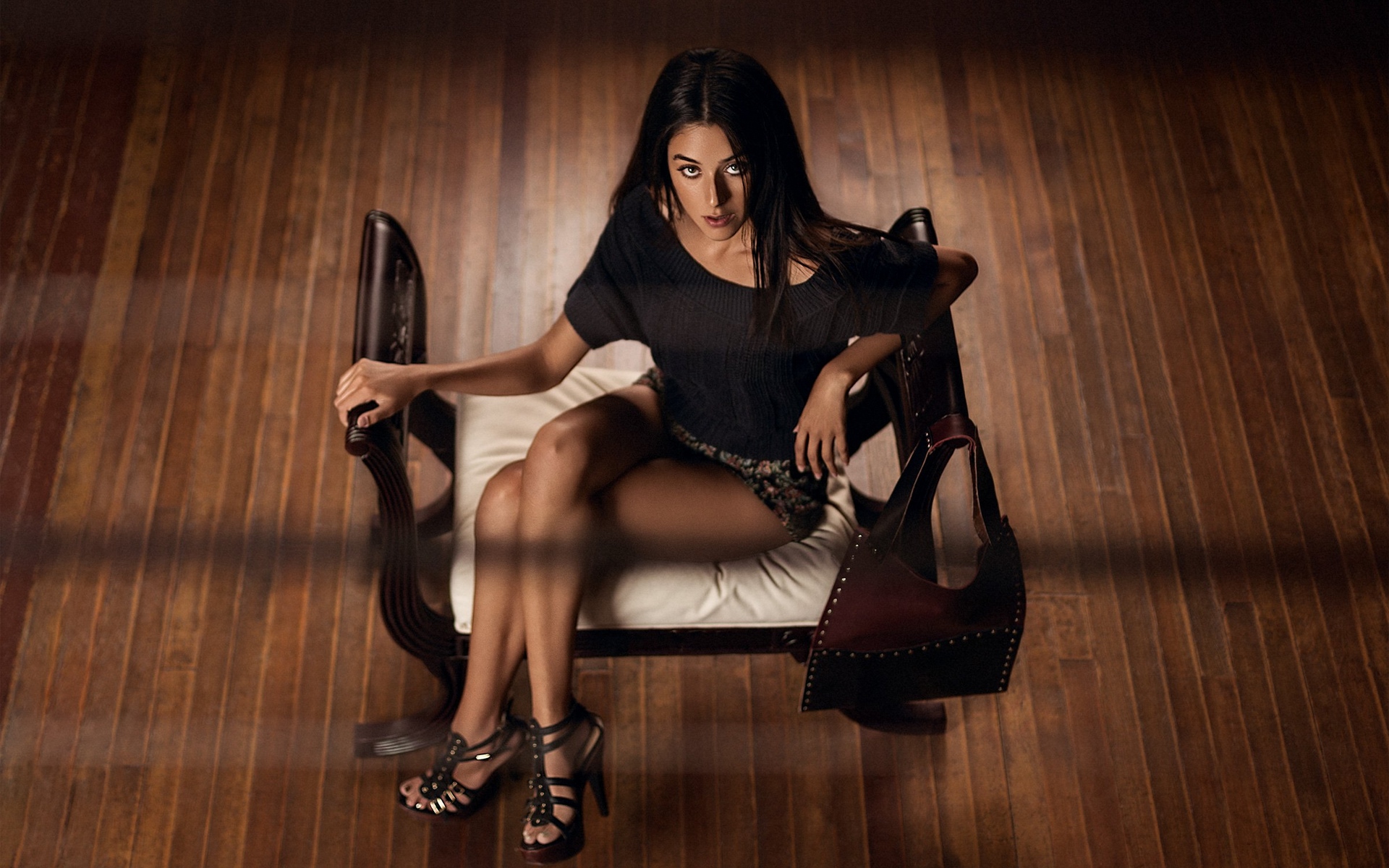 Description: A woman sitting on a chair with her legs crossed and her shoes on the floor behind her.