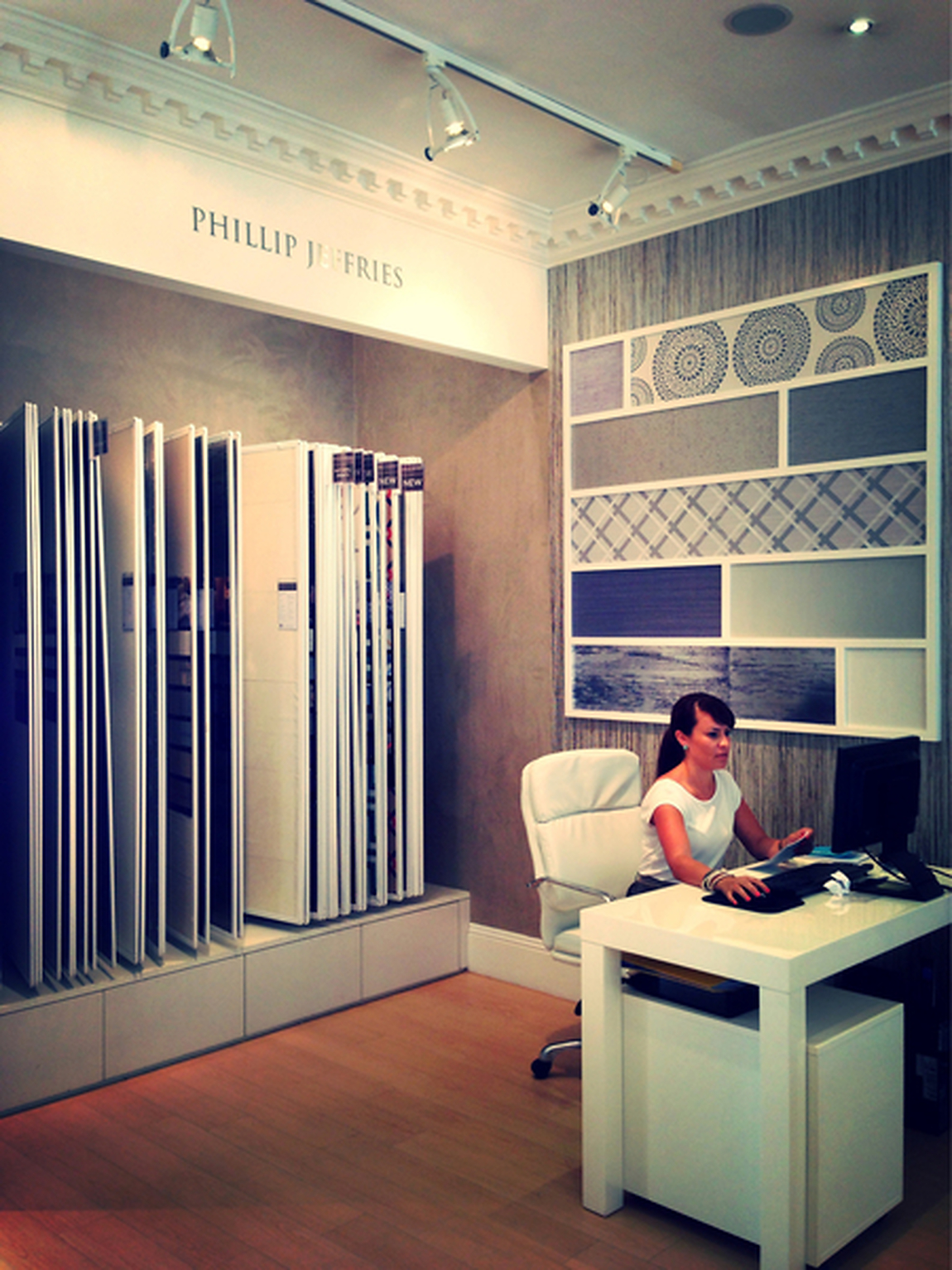 Description: A woman sitting at a desk in front of a computer monitor and a wall of panels behind her is a wall of panels.