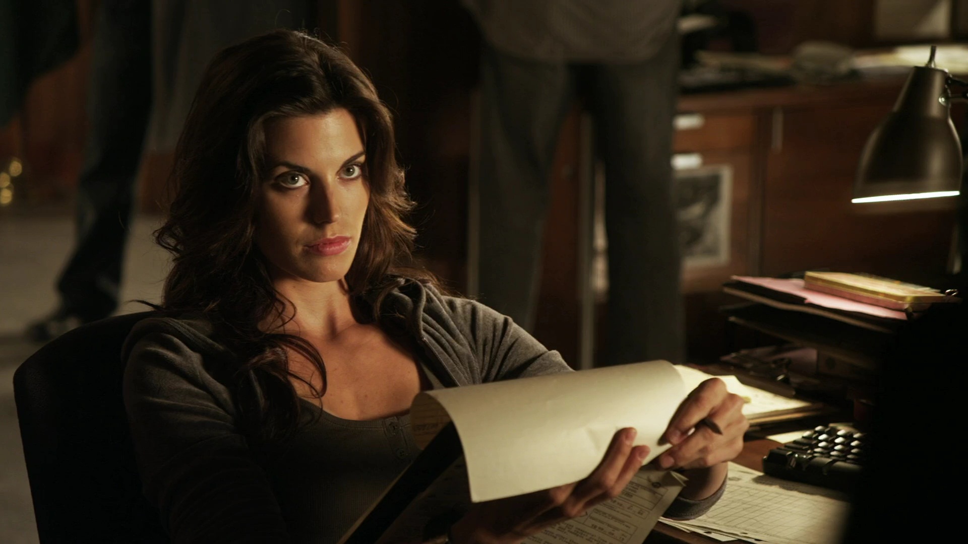 Description: A woman sitting at a desk with a piece of paper in her hand and a pen in her hand.