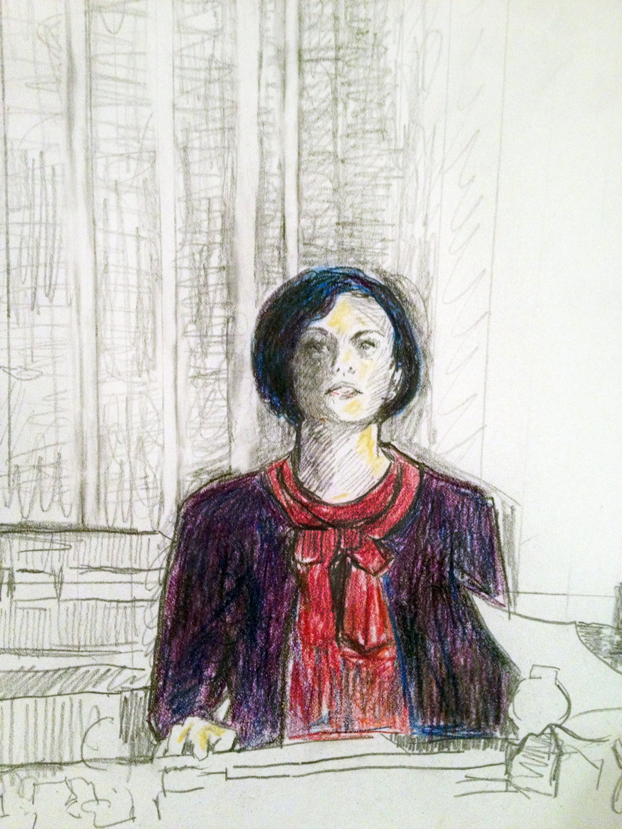Description: A drawing of a woman sitting at a desk in front of a window with a red scarf on her neck.