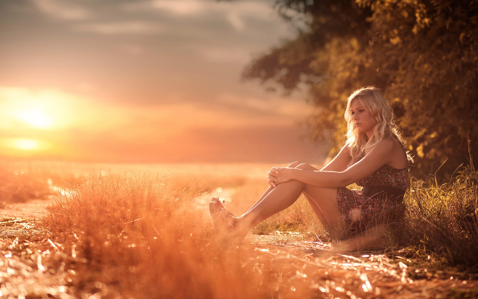 Description: A woman sitting on the ground in a field at sunset with her legs crossed and her legs crossed.