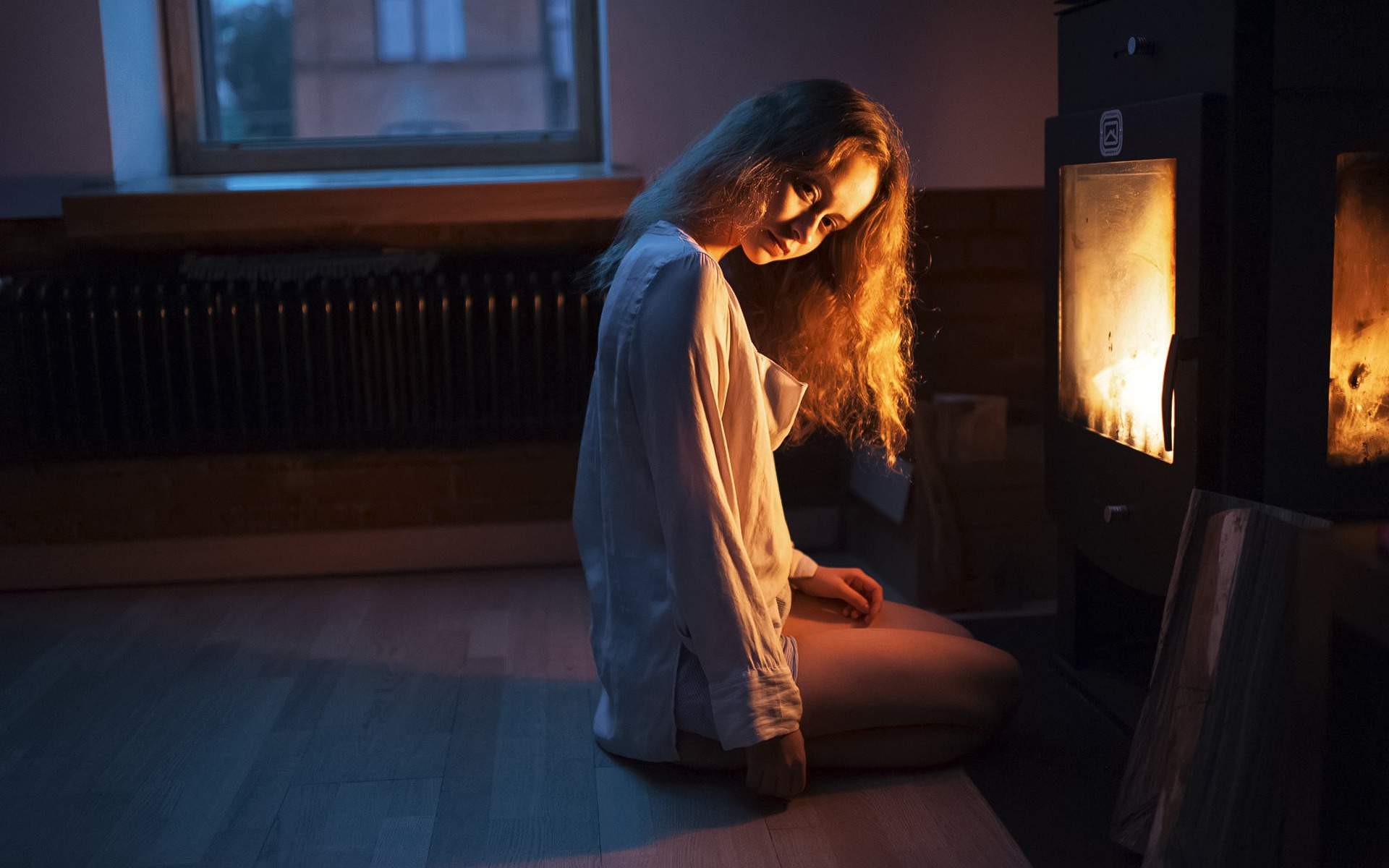 Description: A woman sitting on the floor in front of a fire place with a lit candle in it's corner.