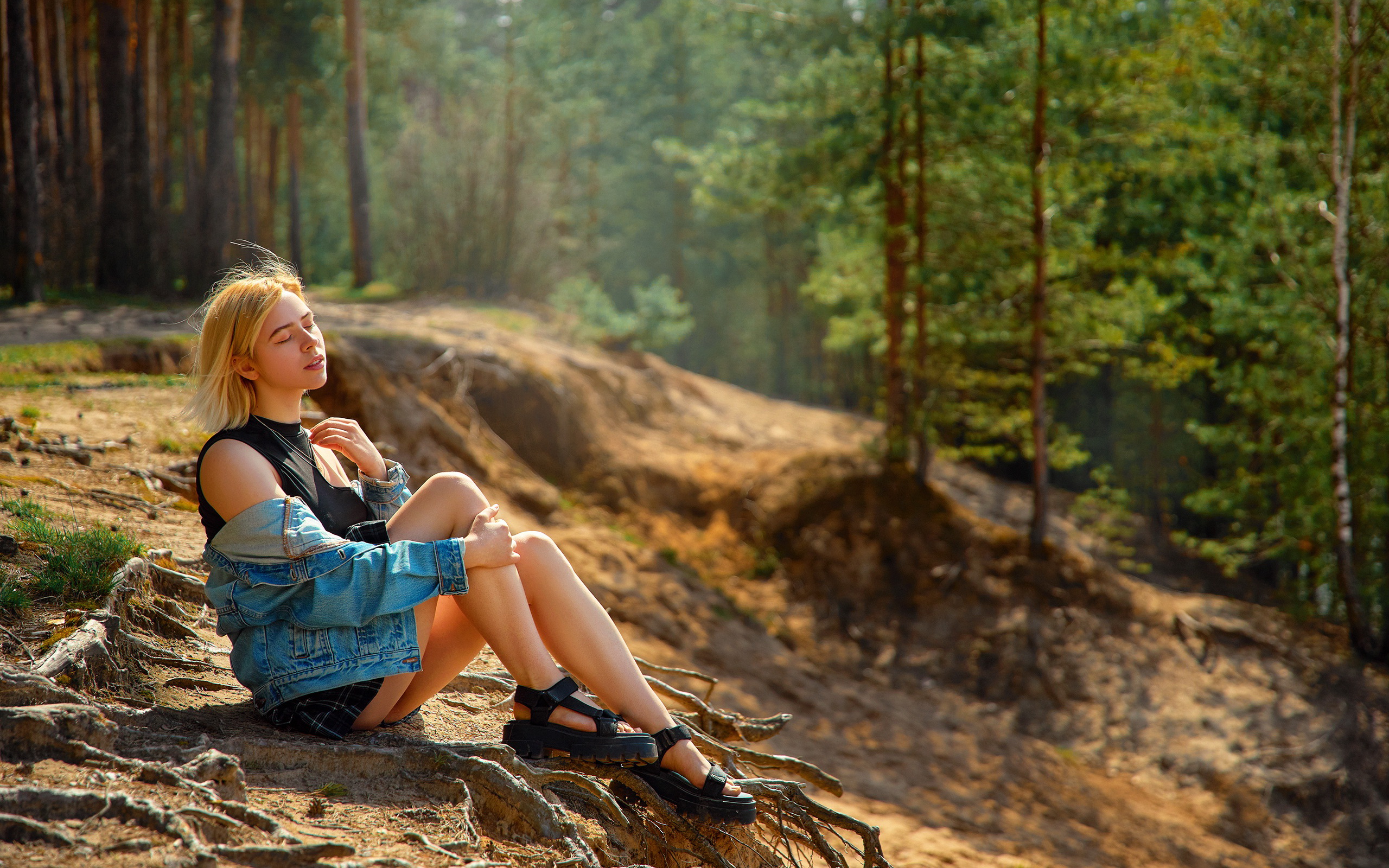Description: A woman sitting on a rock in the woods with her legs crossed and her eyes closed.