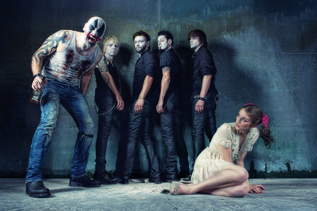 Description: A woman sitting on the ground next to a group of people wearing makeup and costumes.