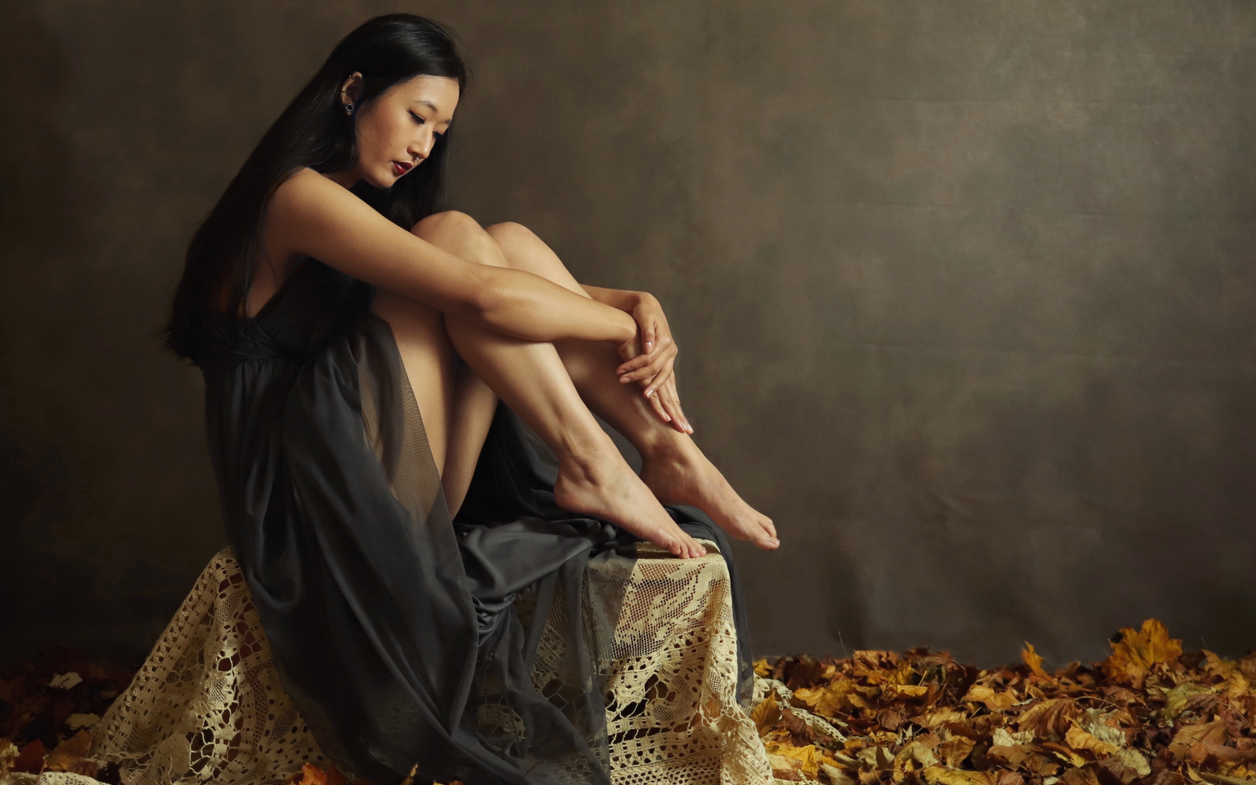 Description: A woman sitting on a chair in a pile of leaves with her legs crossed and her legs crossed.