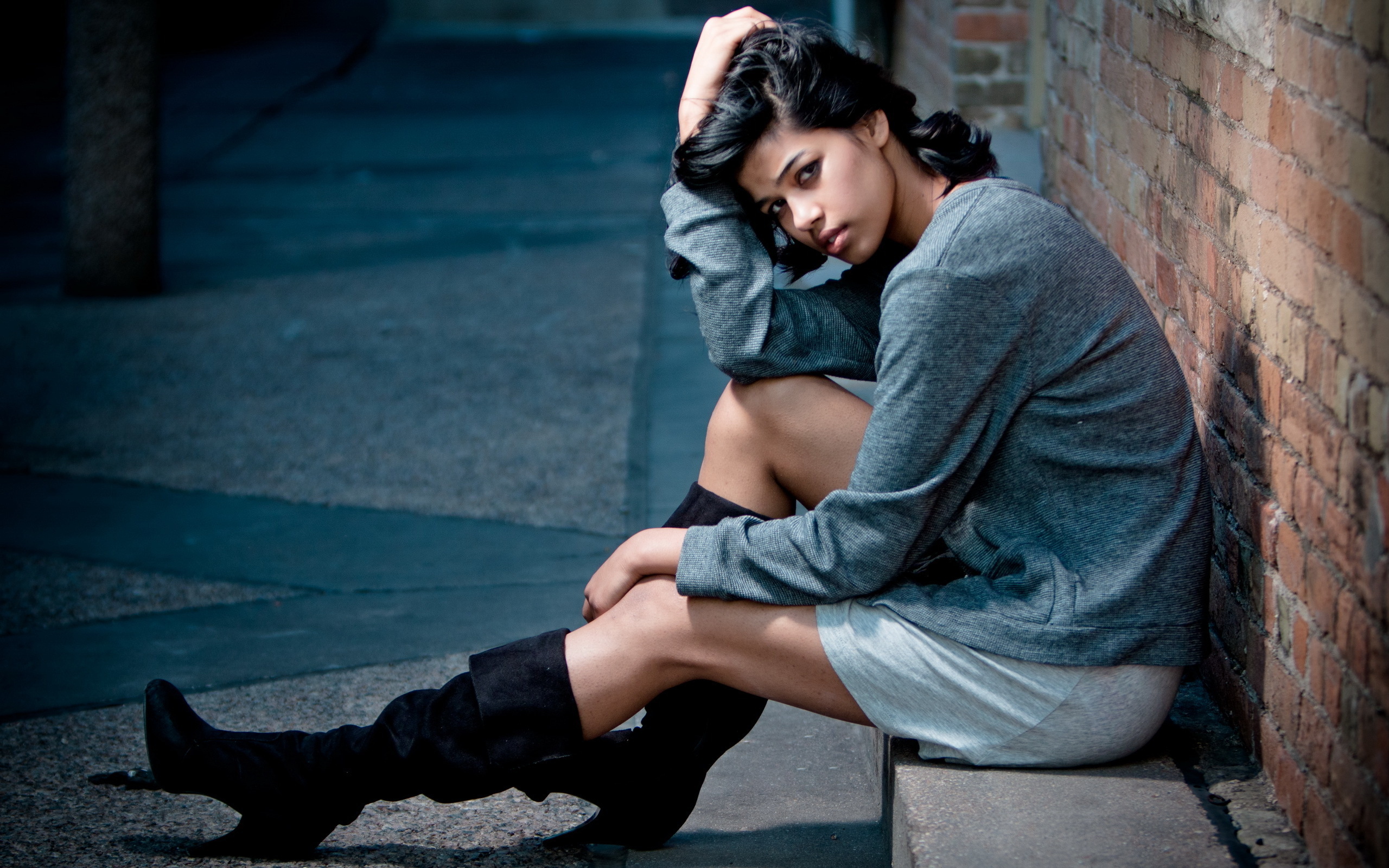 Description: A woman sitting on a ledge with her head on her hand and her hand on her head.
