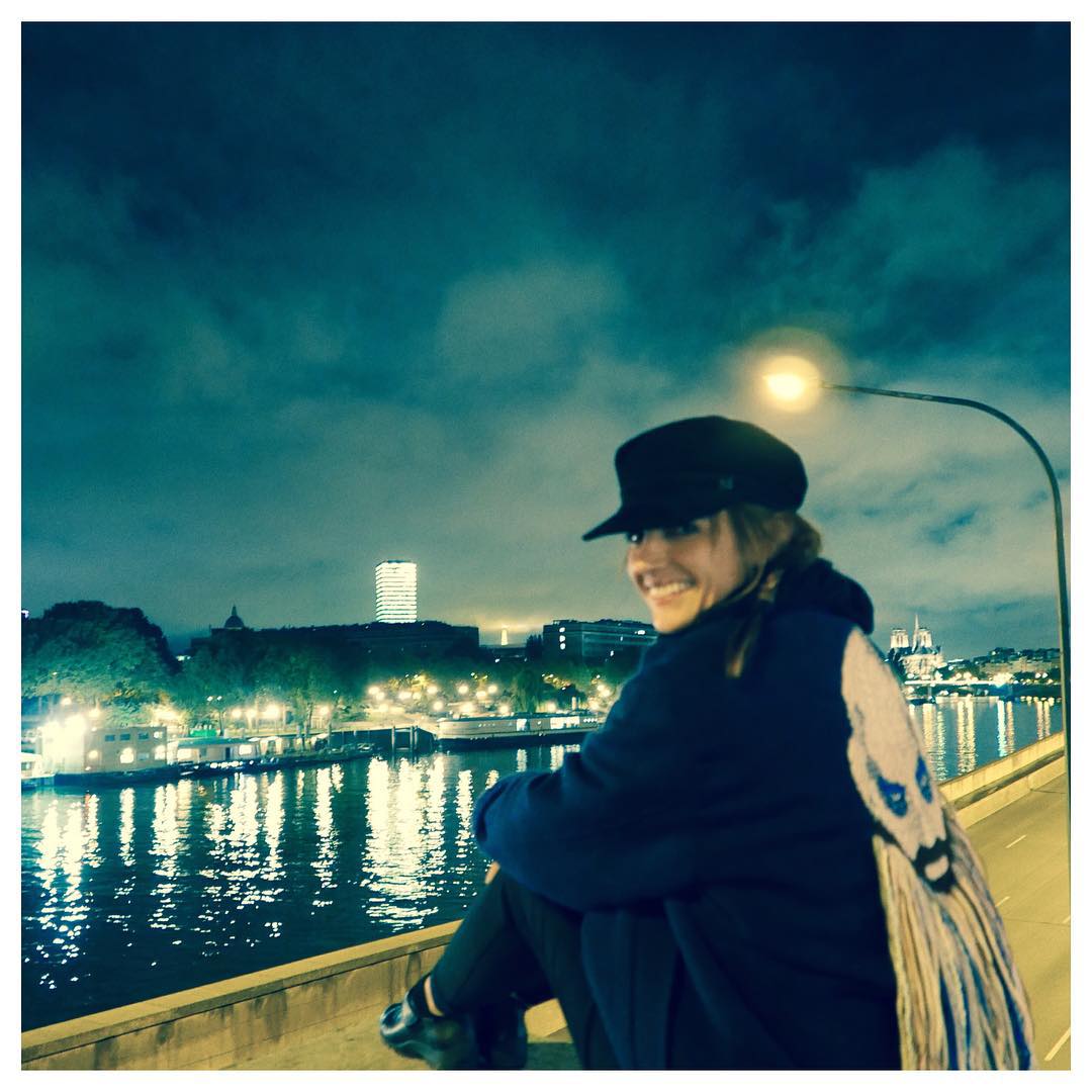Description: A woman sitting on a ledge looking at the water at night with a city in the background and a full moon in the sky.