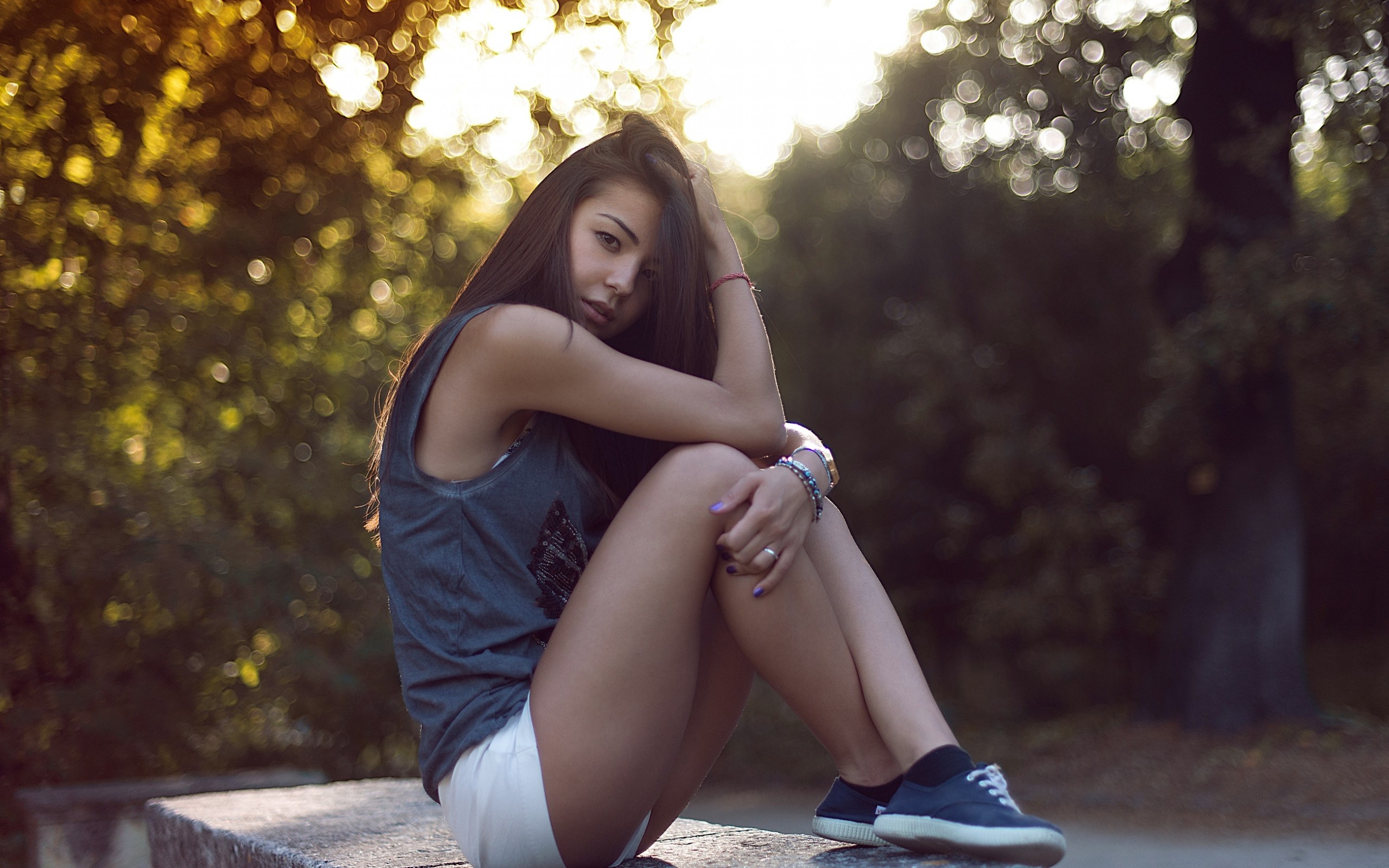 Description: A woman sitting on a bench in a park with her legs crossed and her head resting on her hand.