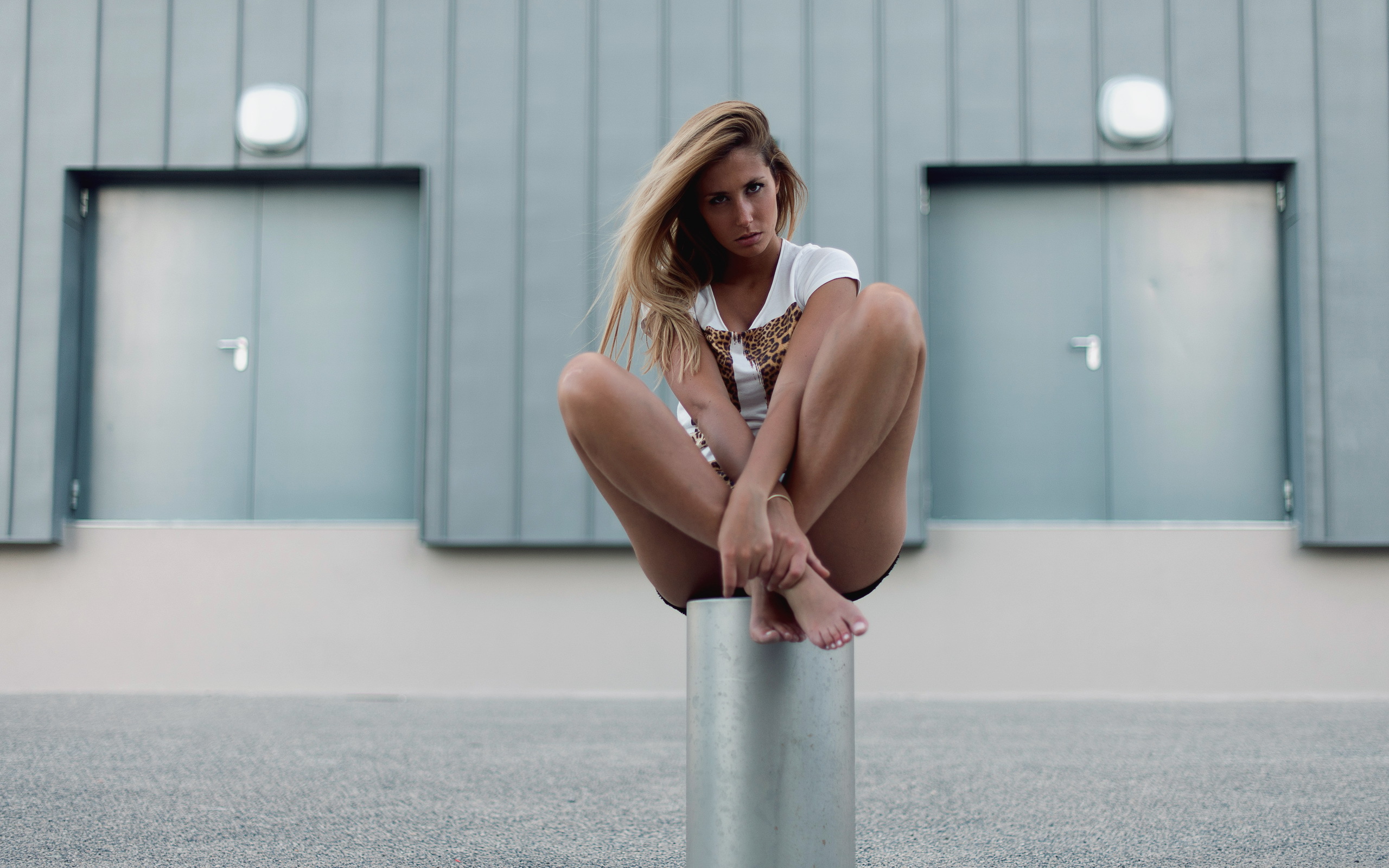 Description: A woman sitting on a pole with her legs crossed and her hands on her knees.