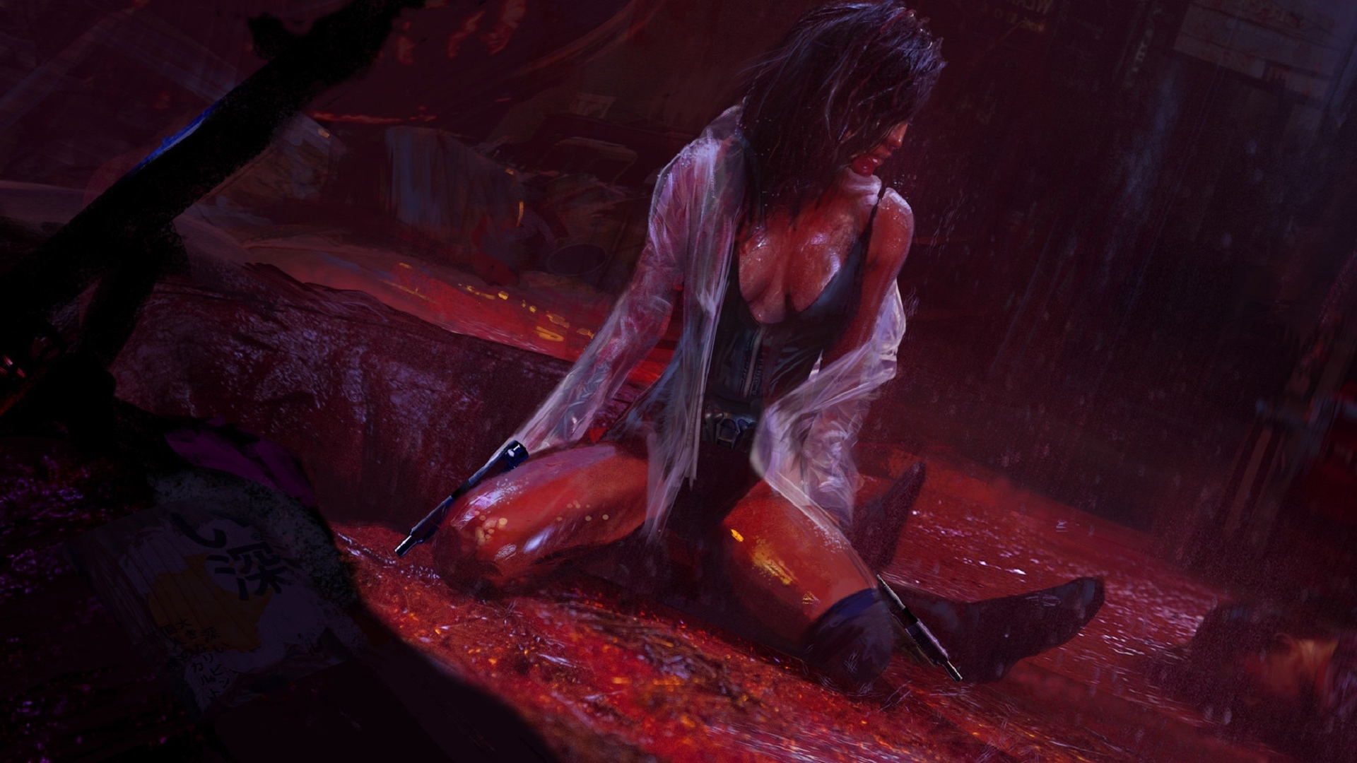 Description: A woman sitting on the ground in the rain with a knife in her hand and a bloody background with a red light.