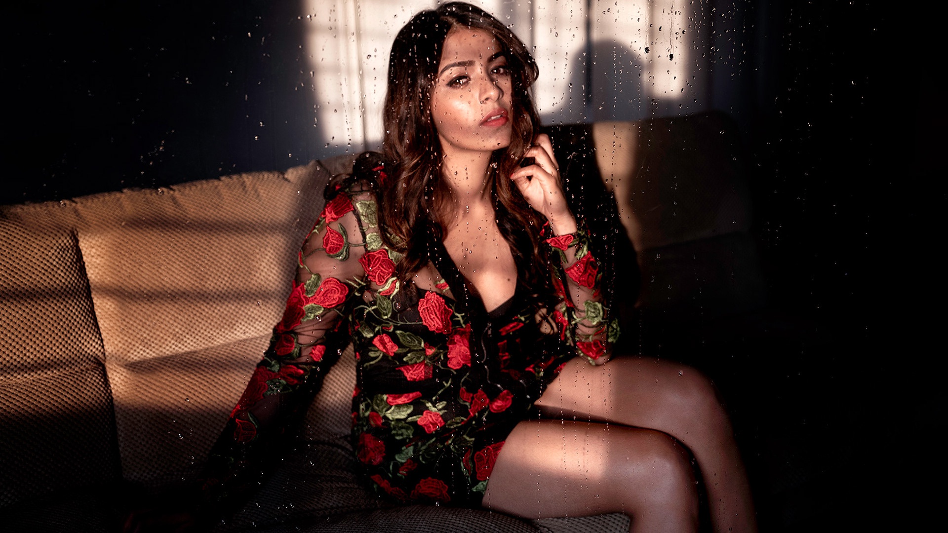 Description: A woman sitting on a couch in a room with a window behind her and rain falling on her face.