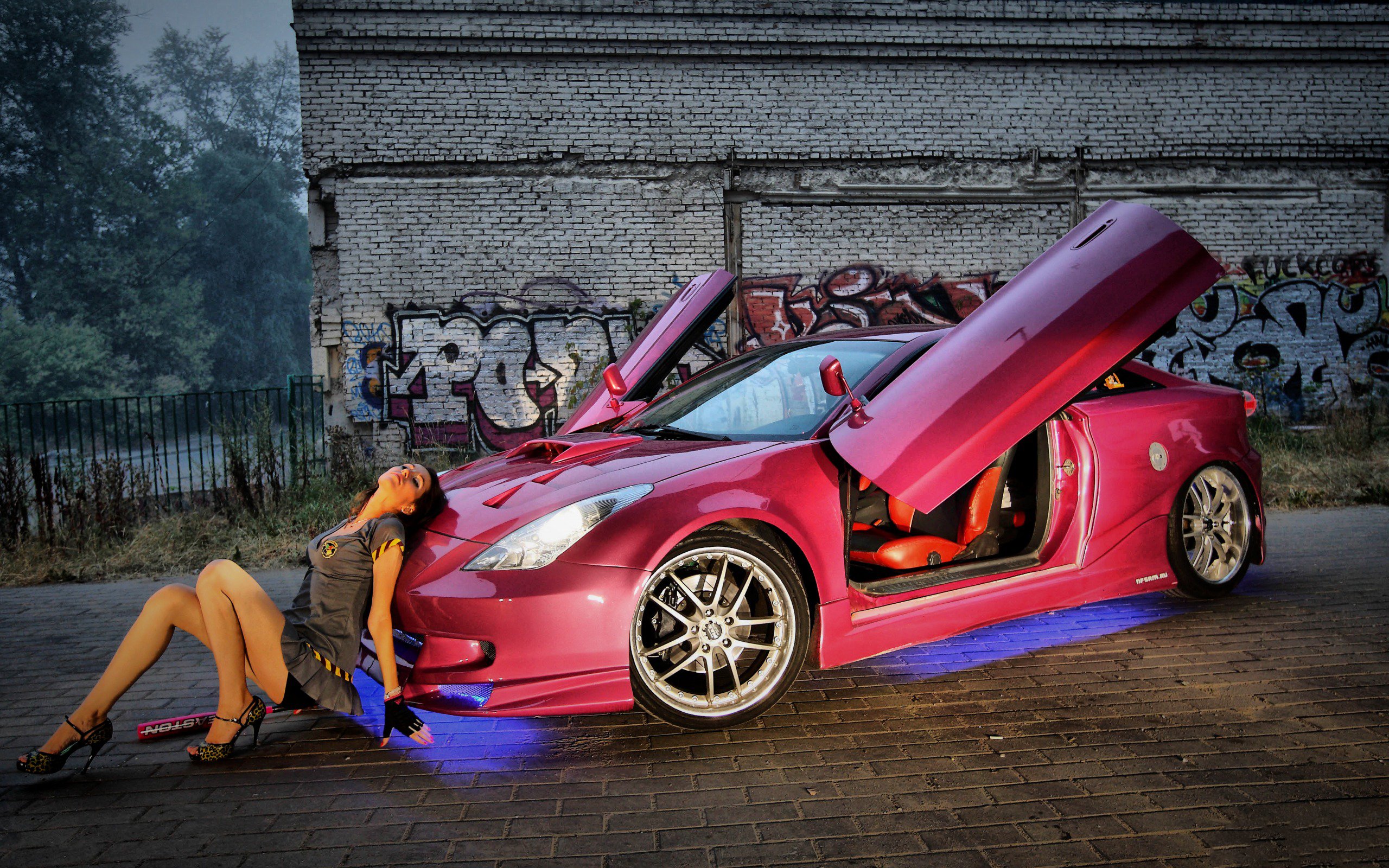 Description: A woman is sitting on the ground next to a red sports car with its doors open and the door open.