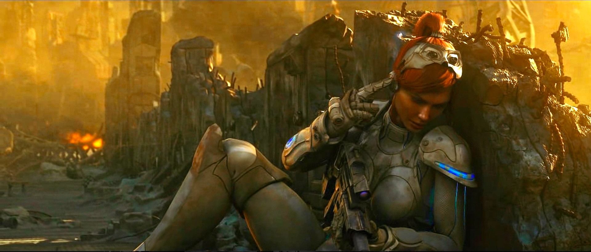 Description: A woman sitting on a rock in a futuristic setting with a fire in the background and a yellow glow.