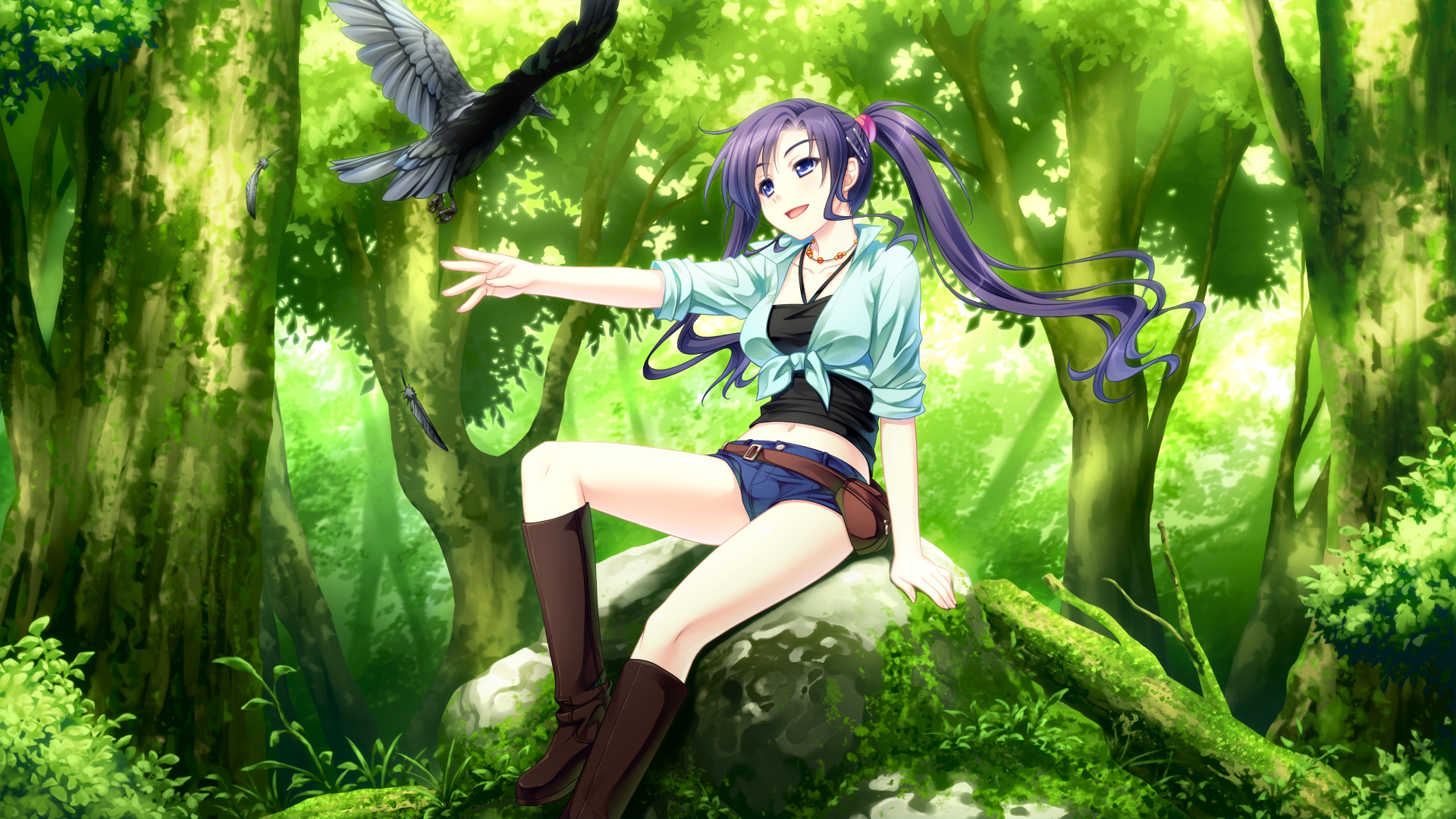 Description: A woman sitting on a rock in the woods with a bird flying overhead her arm is outstretched to the ground.