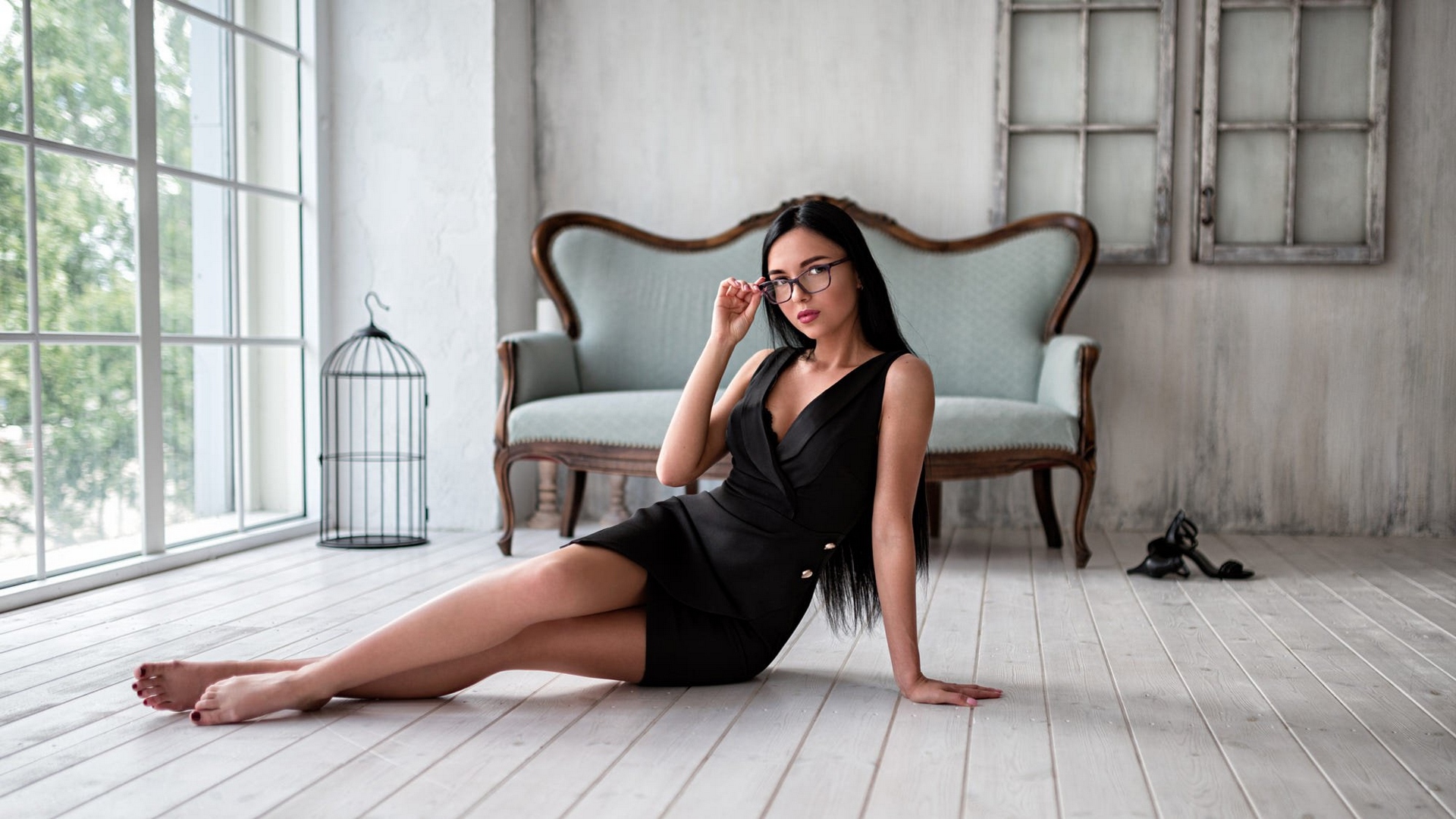 Description: A woman sitting on the floor in a room with a chair and a birdcage on the floor.