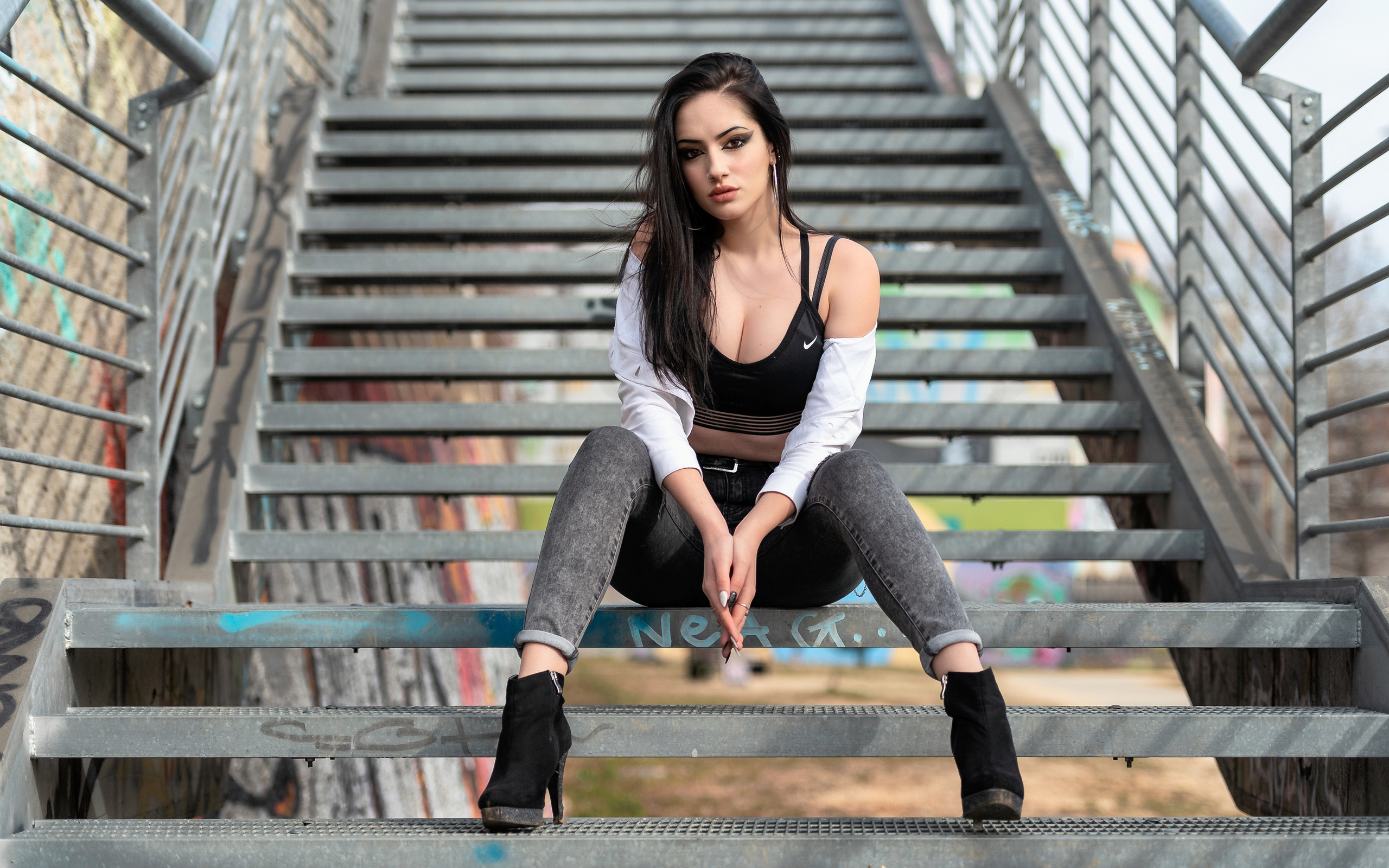 Description: A woman sitting on a set of stairs with her legs crossed and her hand on her knees.