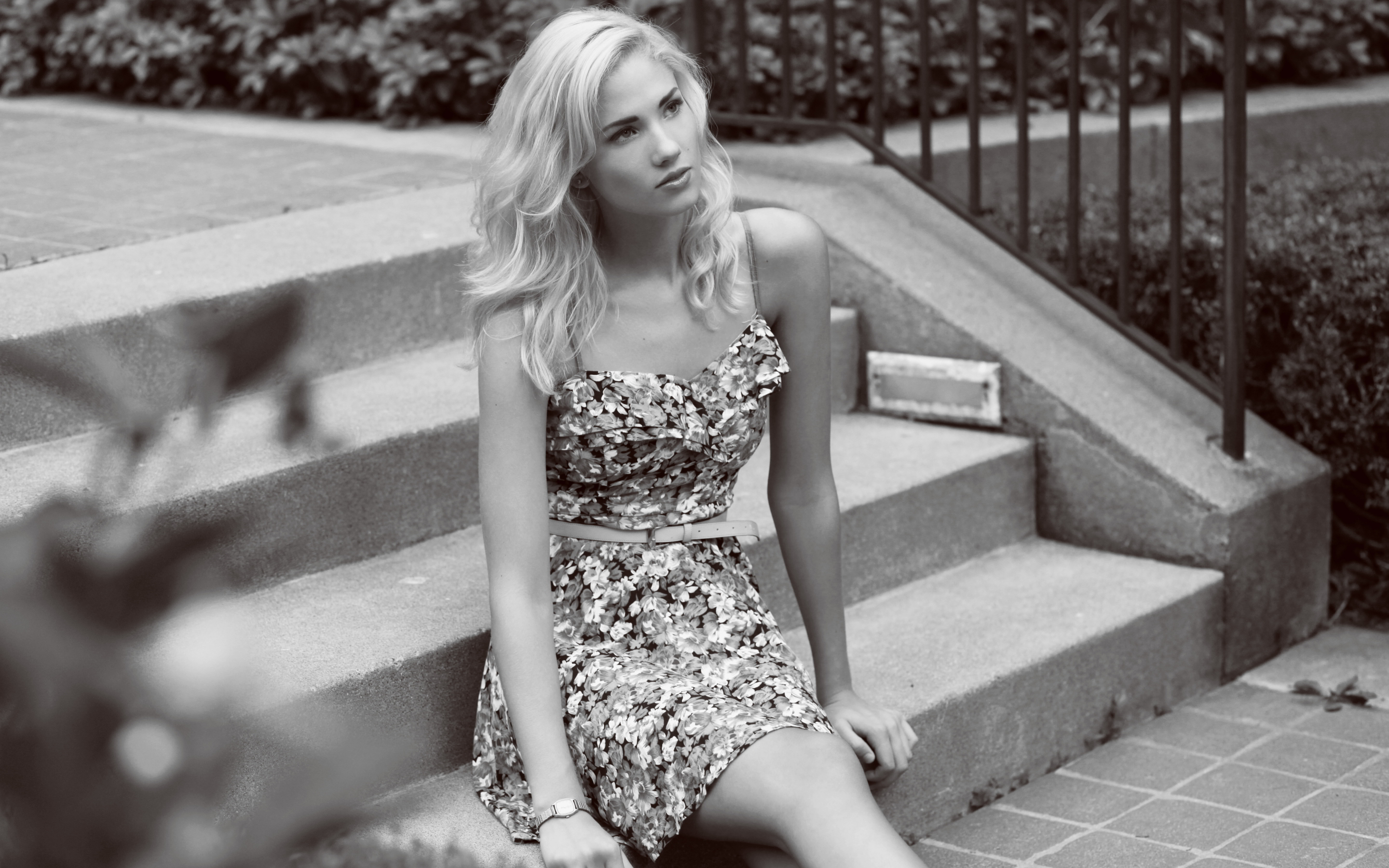 Description: A woman sitting on a set of stairs in a dress and heels with her legs crossed and her hand on her hip.