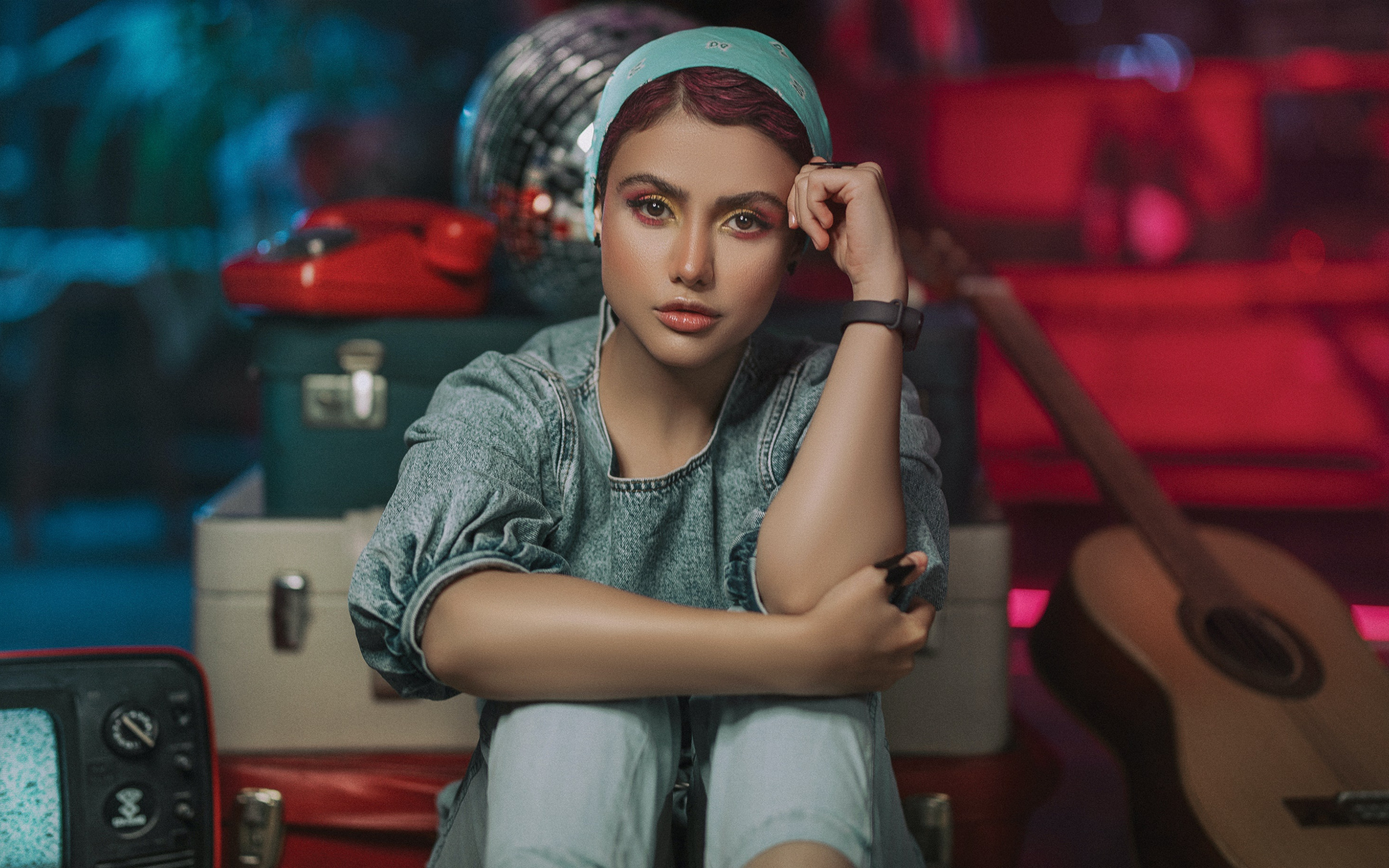 Description: A woman sitting on a suitcase with a guitar in front of her and a suitcase behind her with a guitar in front of her.