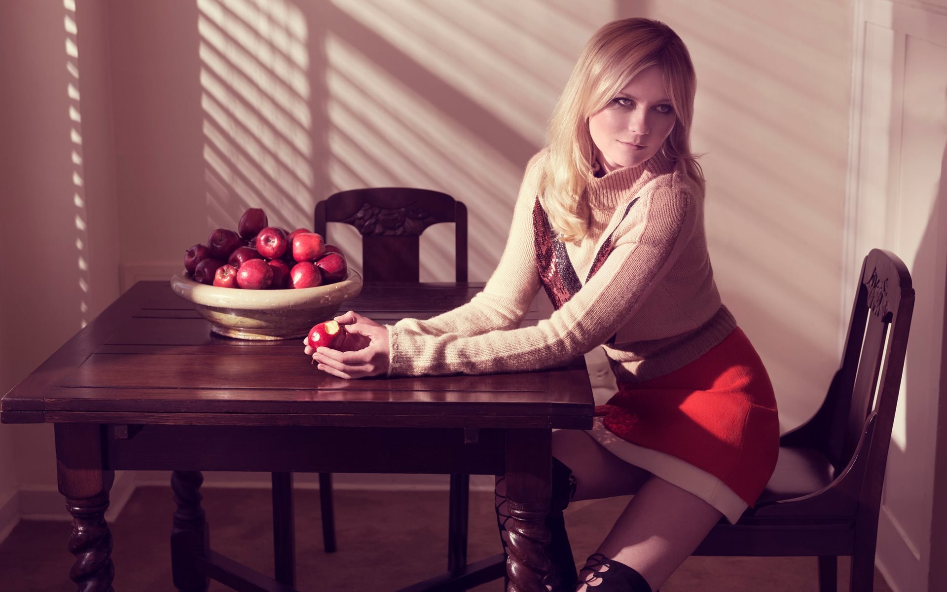 Description: A woman sitting at a table with a bowl of apples in front of her and a bowl of apples in the background.