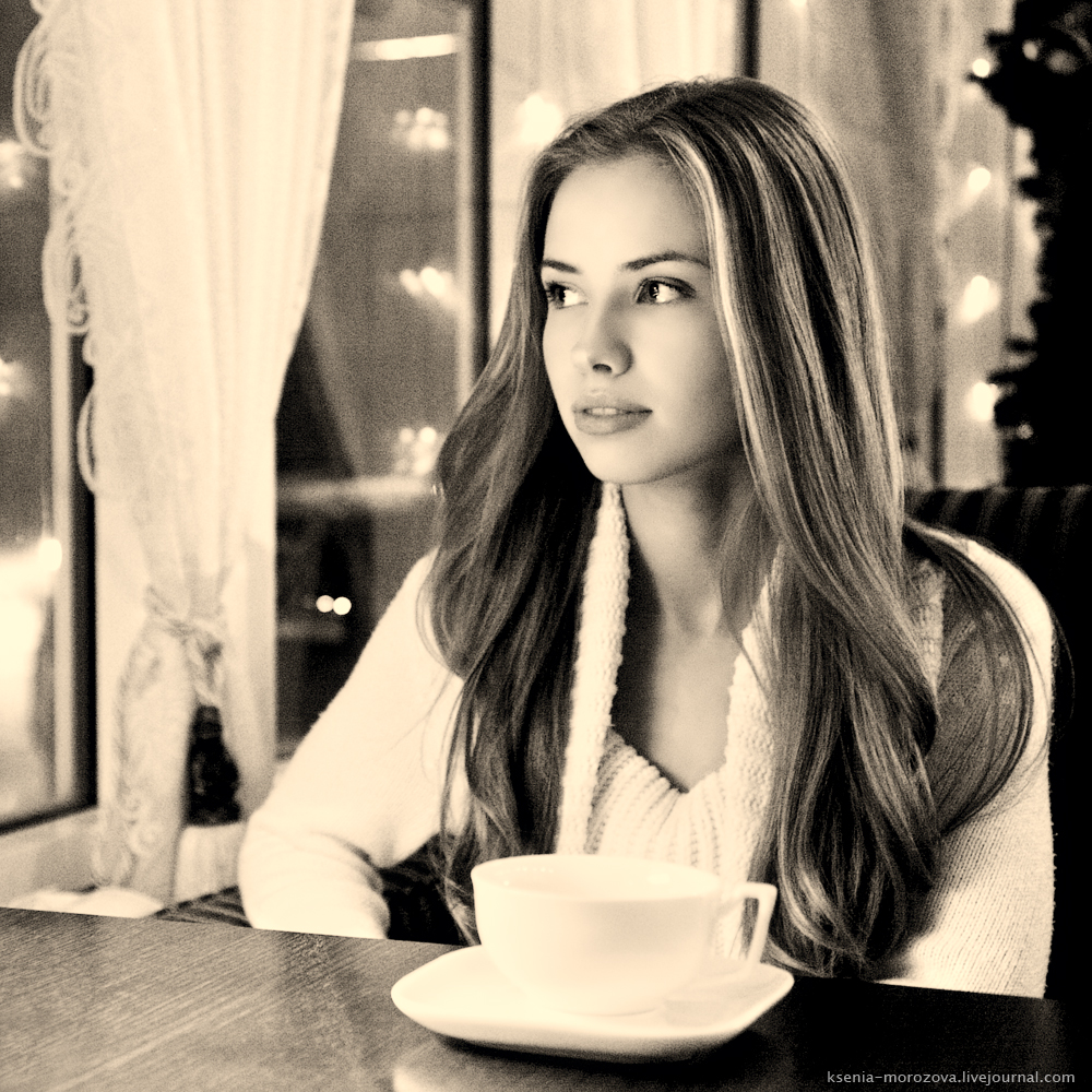 Description: A woman sitting at a table with a cup of coffee in front of her and a window behind her.