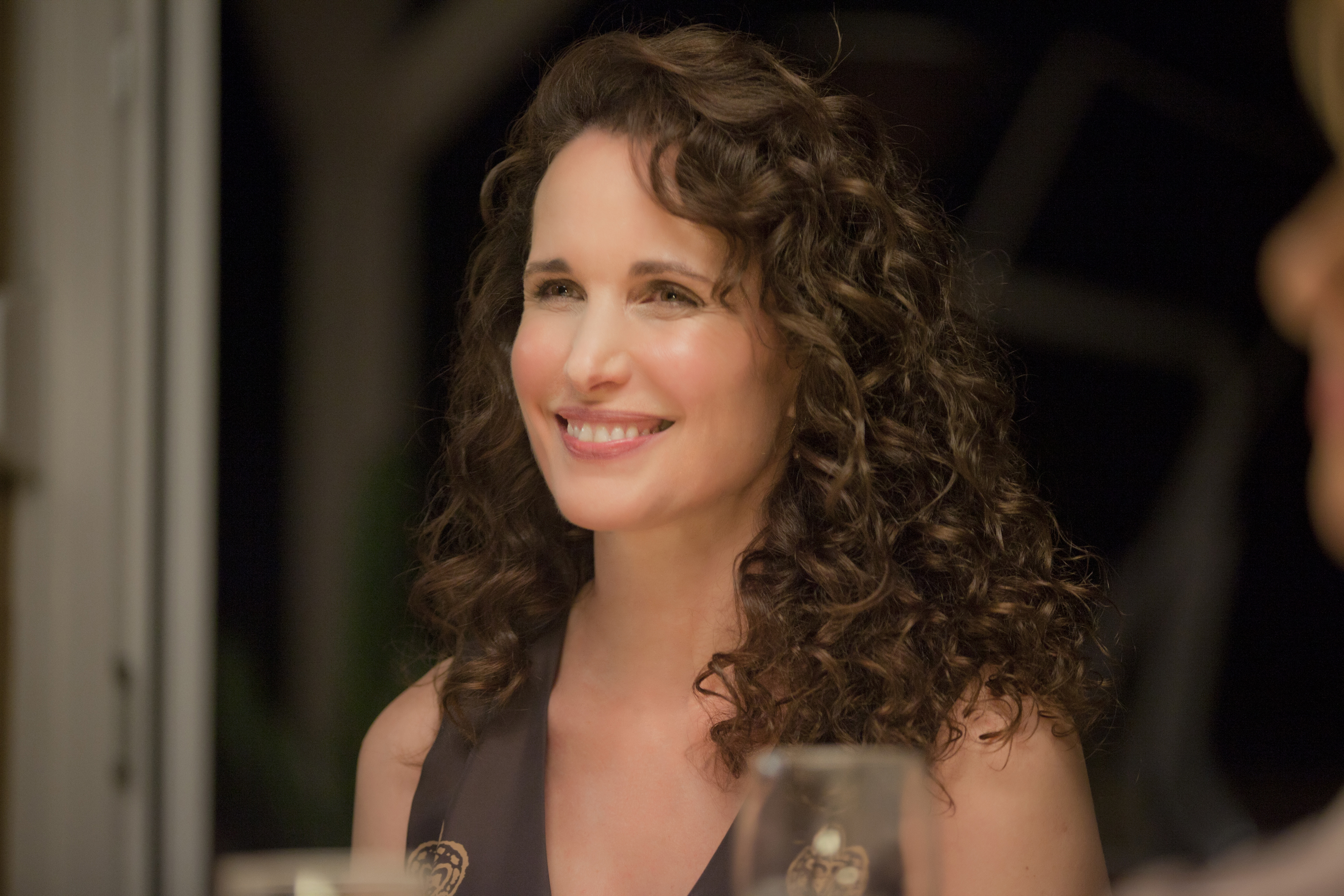 Description: A woman sitting at a table with a glass of wine in front of her and another woman standing behind her.