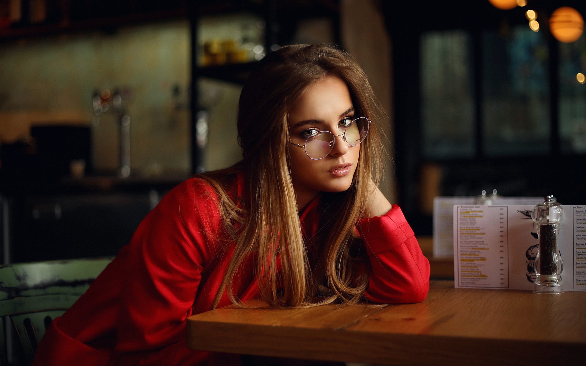 Description: A woman sitting at a table with a menu in front of her and a drink in front of her.