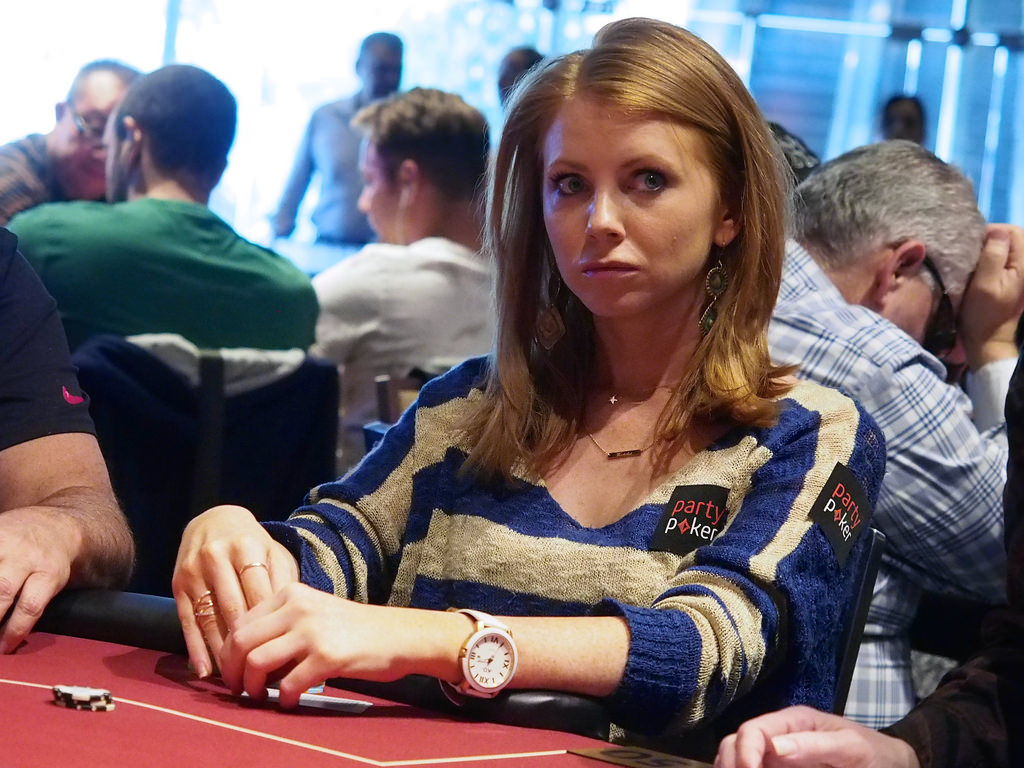 Description: A woman sitting at a table with a watch on her wrist and a man standing behind her looking at the camera.
