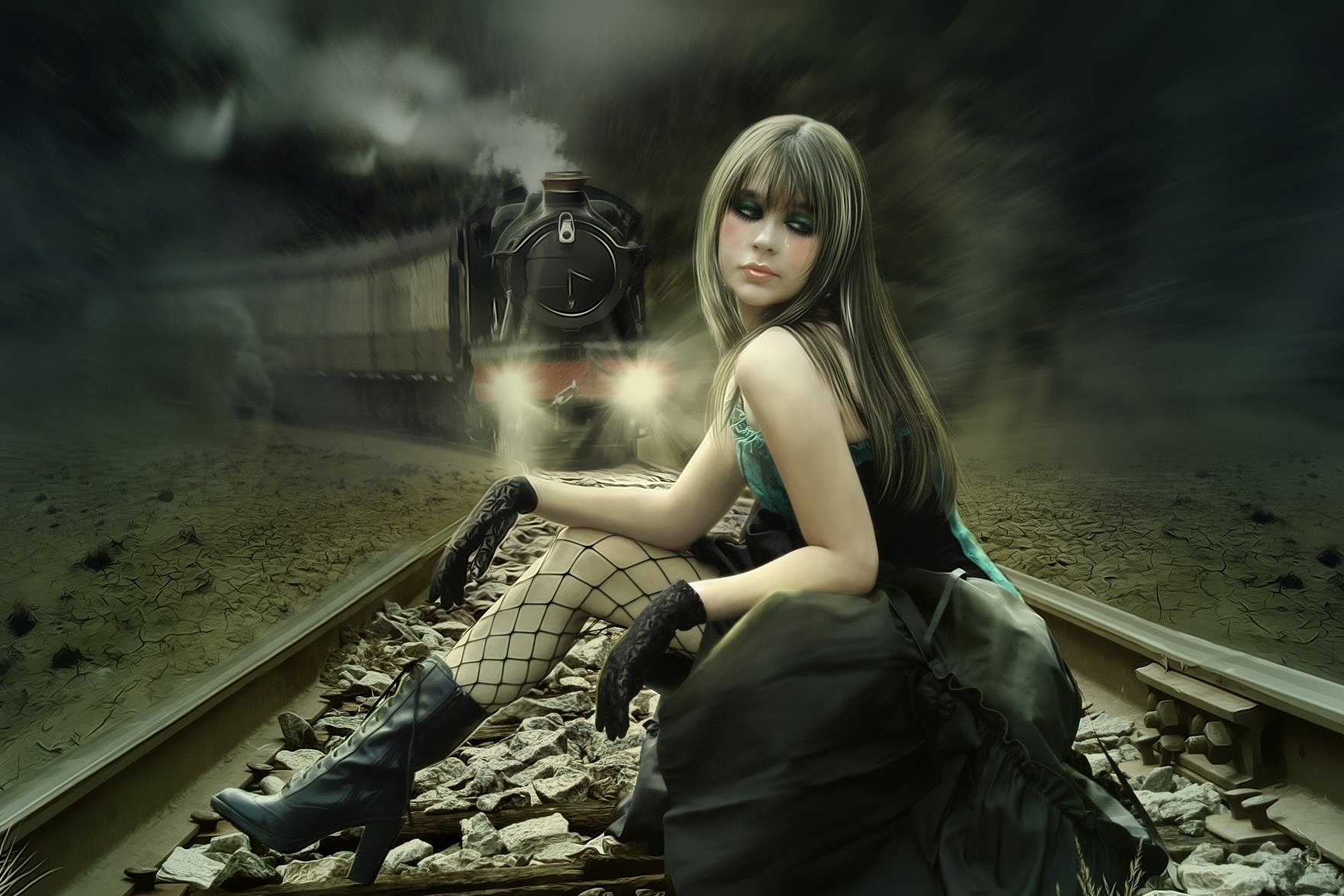 Description: A woman sitting on a train track with a train in the background and a train on the tracks behind her.