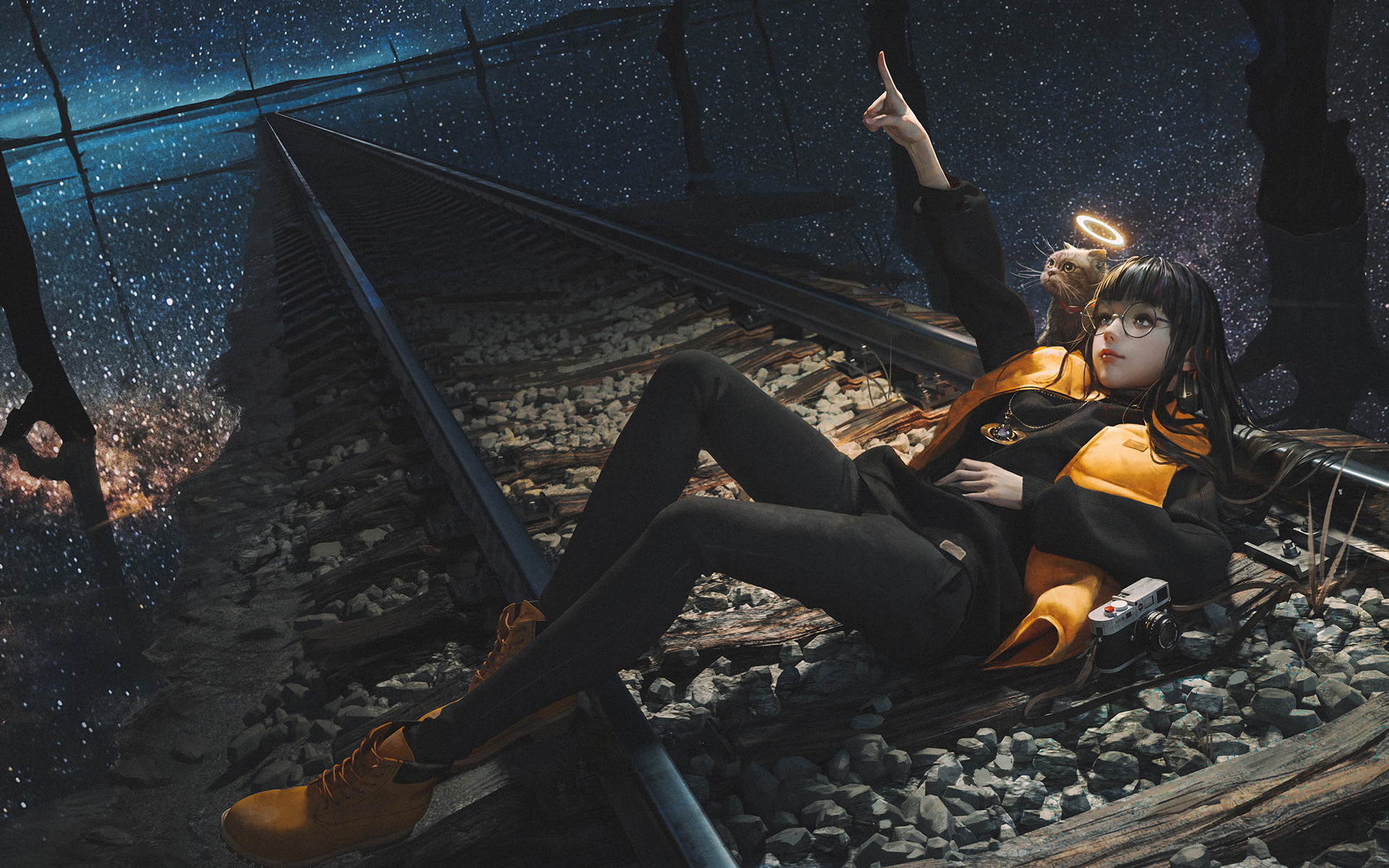 Description: A woman sitting on a train track with her legs crossed and her hand up in the air.
