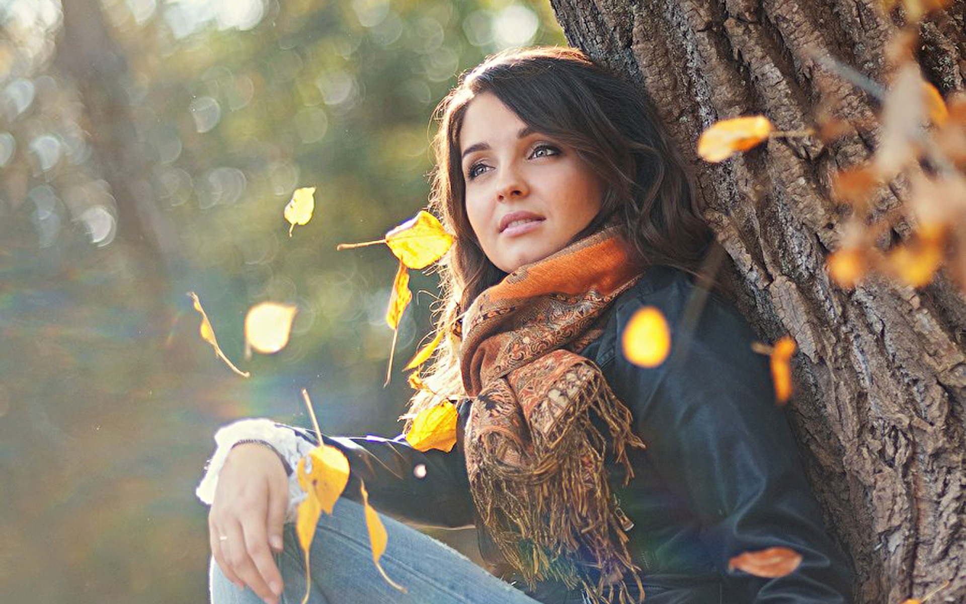 Description: A woman sitting on a tree with leaves falling from her hands and a scarf around her neck.