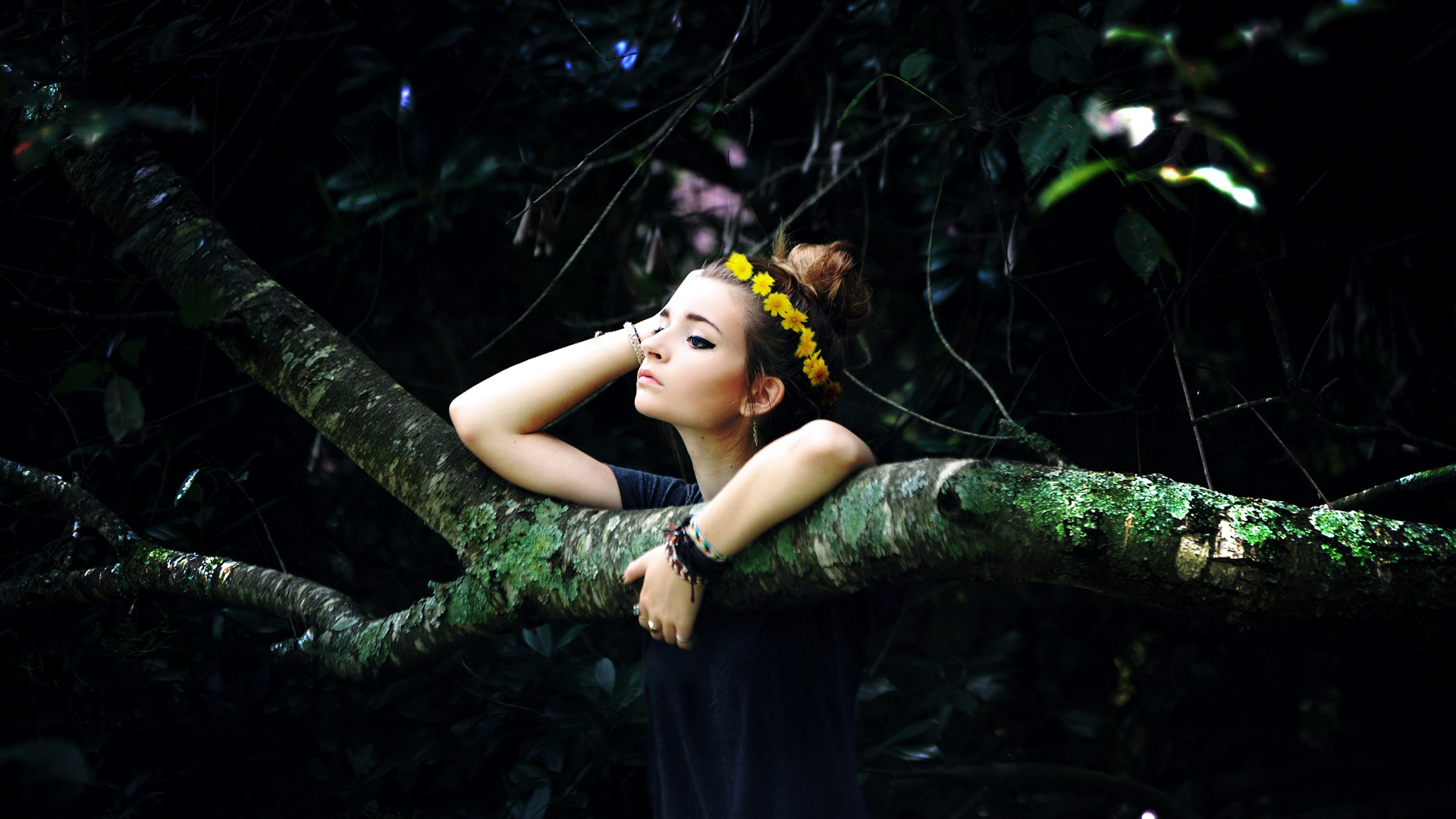 Description: A woman is sitting on a tree branch with her head resting on her hand and her eyes closed.