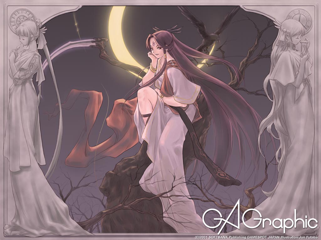 Description: A woman sitting on a tree with a full moon in the background and a full moon in the background.