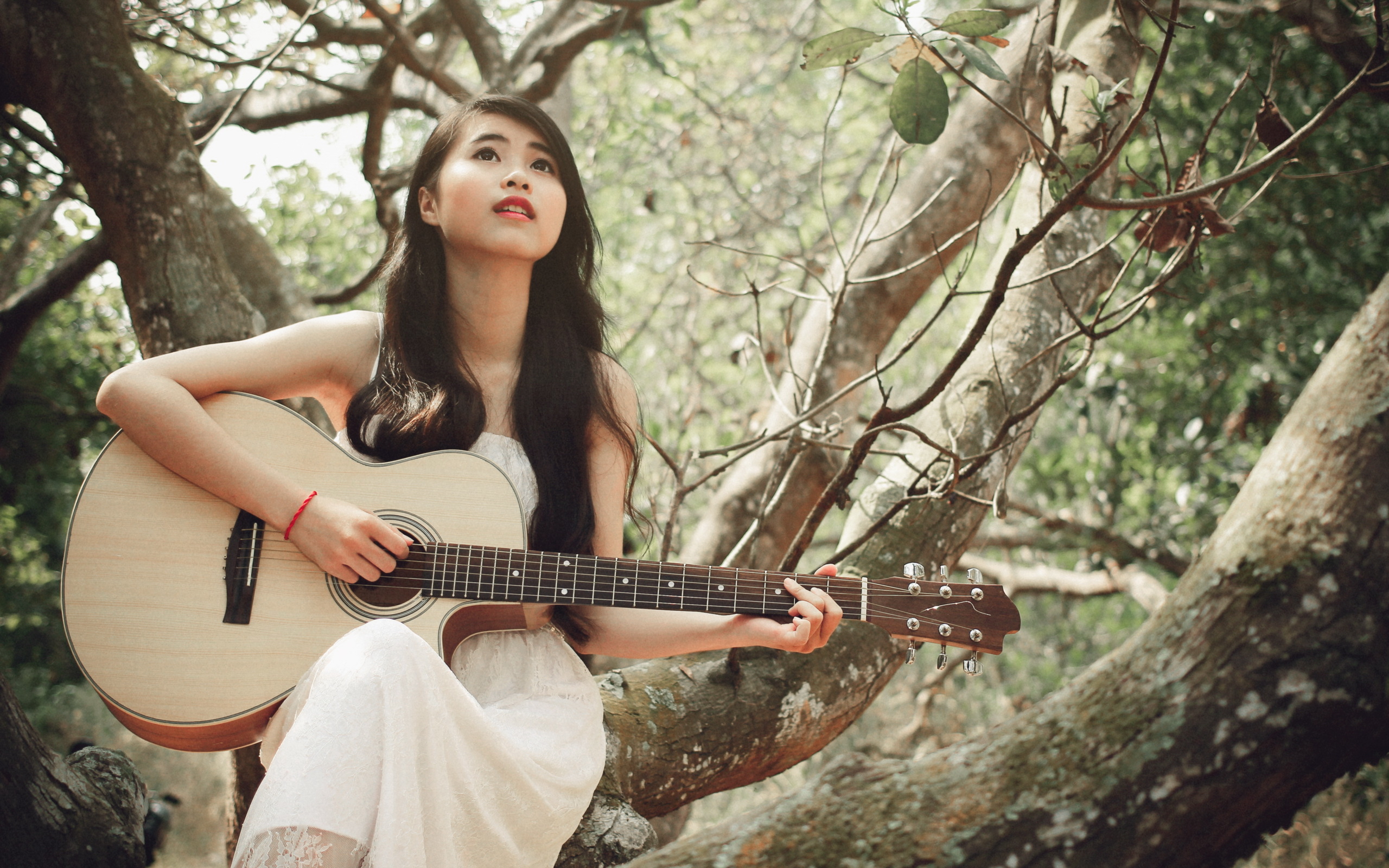 Description: A woman sitting in a tree with a guitar in her hand and looking up at the sky with a smile on her face.