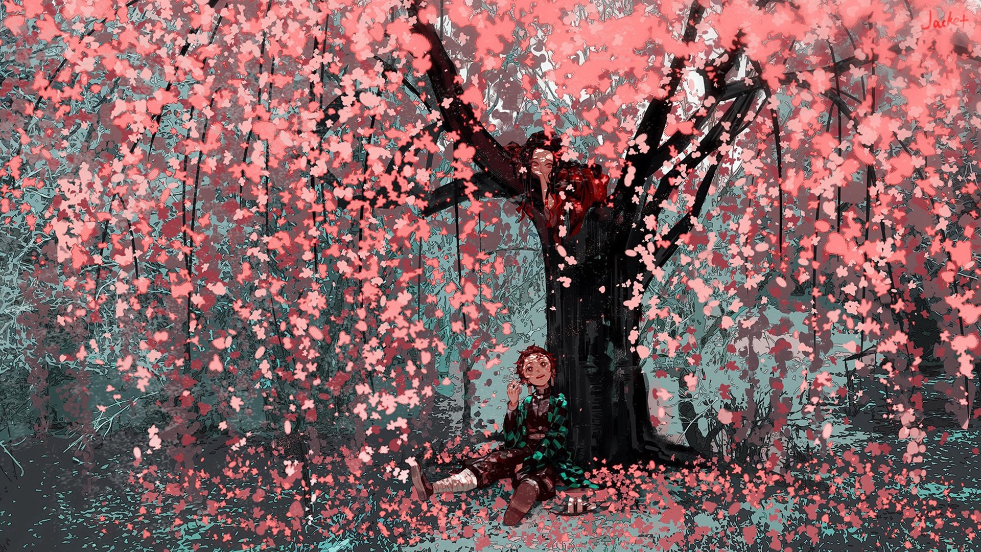 Description: A woman sitting under a tree in a forest with pink leaves on it's branches and a red sky.